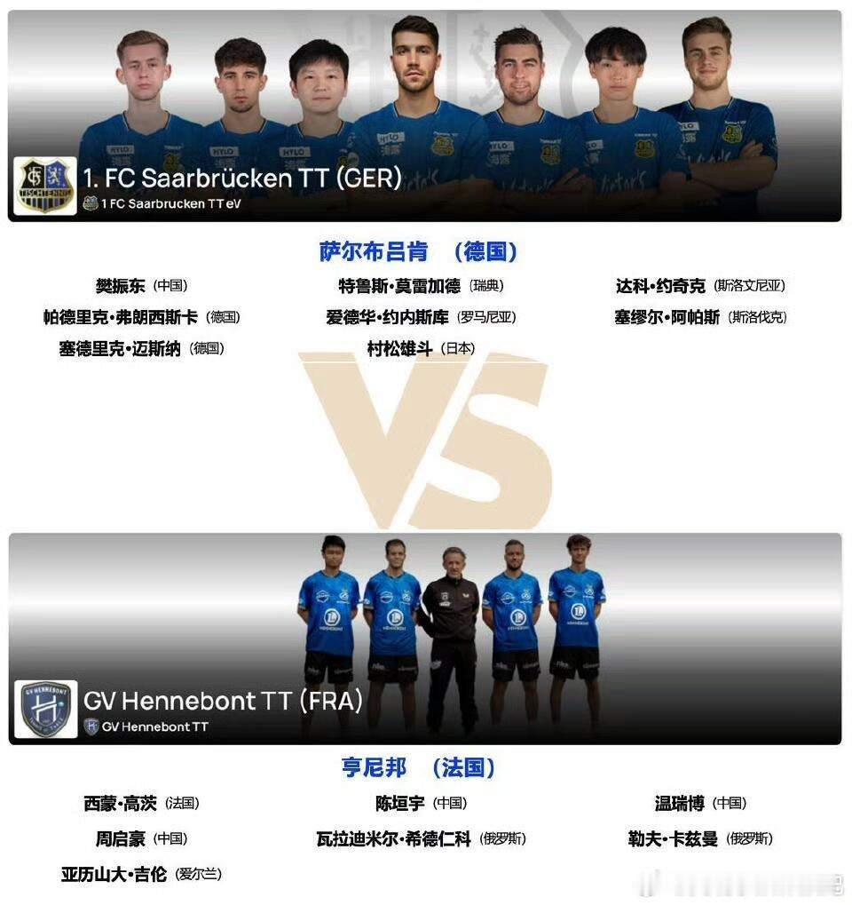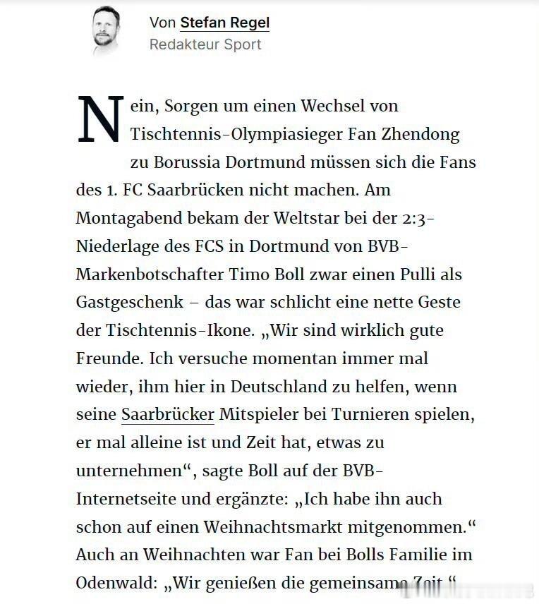 1月19日樊振东莫雷加德首次共同出战来自萨尔日报:萨尔布吕肯的球迷们不用担心,樊振东并不会转会至多特蒙德。在周一晚萨尔布吕肯客场 2:3 不敌多特蒙德的比赛后,这位世界级球星的确是从多特蒙德品牌大使蒂姆・波尔手上接过了一件球衣—— 但只是作为赠礼,只是来自乒坛传奇波尔的一番友好举动罢了。萨尔队员周四乘车前往图林根州(穆尔豪森主场),与穆尔豪森这场联赛一结束,球队就得连夜赶回萨尔布吕肯,周六清晨再奔赴法国,客场挑战亨尼邦俱乐部,开启欧冠四分之一决赛首回合较量。对手的阵容除法国运动员西蒙・高茨之外,还有三名中国球员陈垣宇(世排23)、周启豪(世排36)、温瑞博(世排53)。目前不清楚亨尼邦会派出哪些球员。奥运亚军莫雷加德也将加入萨尔布吕肯的欧冠阵容。他需要出战两场欧冠赛事,才能获得在萨尔兰体育馆举办的欧冠决赛阶段的参赛资格。尽管对手实力强劲,但萨尔布吕肯拥有奥运冠亚军樊振东与莫雷加德这对组合,两人首次共同身穿萨尔布吕肯球衣出战。1月19号期待樊振东,期待萨尔布吕肯!