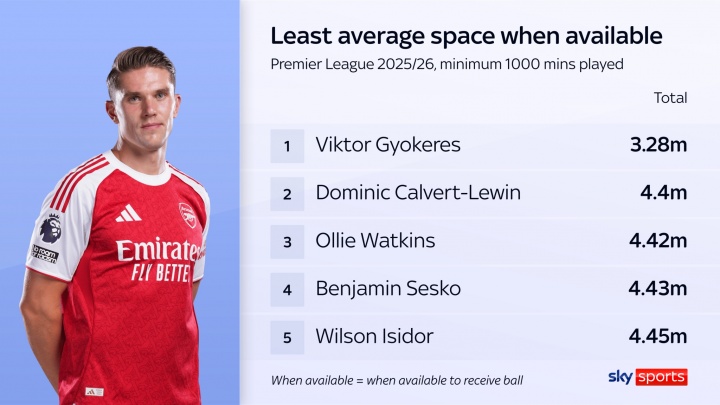 在英超球员持球时的平均“可行动空间”排行榜上,约克雷斯以3.28米的数据排名英超最低。