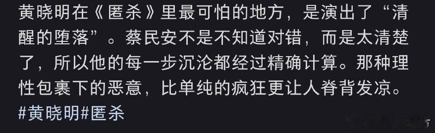 没想到越老实的人下手越狠 有时候,简单的外表之下藏着复杂的心理,这种反差越明显,越令人恐惧,黄晓明将这种感觉表现得淋漓尽致,让人不寒而栗。