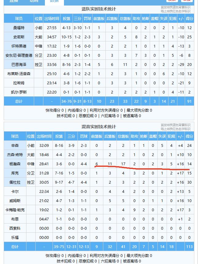 本场篮板球抢到爆,杨瀚森代表混音队第二次打蓝队,拿下14分17板2助2帽。 更多时间小杨是作为蓝领在使,接到球的机会不是很多,不过他防守端的威慑力不小,可以说是很好地完成了内线护框。 小杨全场出场31分钟,6中3,罚球4中4,17个篮板球,其中6个前场篮板。同时还有3次失误和5次犯规。 有好几次漂亮传球,队友都不太给力,没有打进,不然助攻得有六七个了。