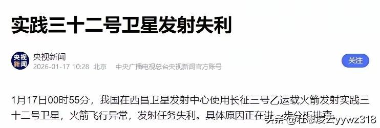 揪心!金牌火箭长三乙失利 航天探索咋破局 刷到长三乙发射失利的新闻时,我心里咯噔一下。2026年1月17日00时55分,西昌卫星发射中心的夜空被火箭烈焰骤然点亮,承载着实践三十二号卫星的长征三号乙一飞冲天,现场观众的欢呼声还没落下,意外就发生了。火箭飞行突发异常,官方很快官宣发射未达预期目标,具体原因正在紧急排查,这颗肩负空间新技术试验使命的卫星能不能通过轨道抬升挽救,至今还是个未知数,这份惋惜戳中了很多关注航天人的心底。 说长三乙是中国航天的金牌老将,没人有异议。从1996年首飞至今,它完成了100次宇航发射,把北斗组网卫星、嫦娥三号、嫦娥四号这些国之重器精准送入预定轨道,98.6%的成功率在全球运载火箭家族里都名列前茅。可航天探索从来没有绝对的坦途,这不是它第一次遇到状况,此前曾因三级点火异常出现过3次部分失利,但每次失利后,航天团队都靠着严苛的双五条归零制度深挖问题根源,让这枚金牌火箭重新扛起重任。 无独有偶,就在5天前的1月12日,印度最成熟的PSLV火箭发射16颗卫星,同样因为第三级异常导致卫星全部丢失,这已是该型号连续第二次栽在同一环节。航天本就是刀尖上的舞蹈,1996年长三乙首飞时,曾因一根细如发丝的导丝脱焊酿成事故,龙乐豪院士带领团队挑灯夜战一个月才找到症结,那句颗颗螺钉连着航天事业,小小按钮维系民族尊严的口号,就是中国航天人从失利里淬炼出的信念。 这次实践三十二号要验证的新型通信和姿态控制技术,本就是在闯无人区,高风险本就藏在任务基因里。但中国航天从来不是靠一帆风顺走到今天,每一次失利都是通往星辰大海的铺路石。你觉得航天探索该稳扎稳打还是大胆试错?快来评论区说说你的看法。