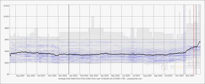 PCPartPicker的价格追踪曲线清晰地展示了这一趋势:过去两个月内,4TBSSD的价格出现了剧烈攀升。图表中价格分布范围的扩大(灰色区域),暗示着旧价格体系下的库存正在逐渐消失。