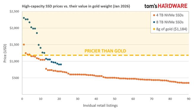 IT之家1月17日消息,科技媒体Tom'sHardware昨日(1月16日)发布博文,报道称受人工智能芯片短缺影响,大容量NVMe固态硬盘(SSD)价格飙升,部分型号的“重量单价”已超越黄金。