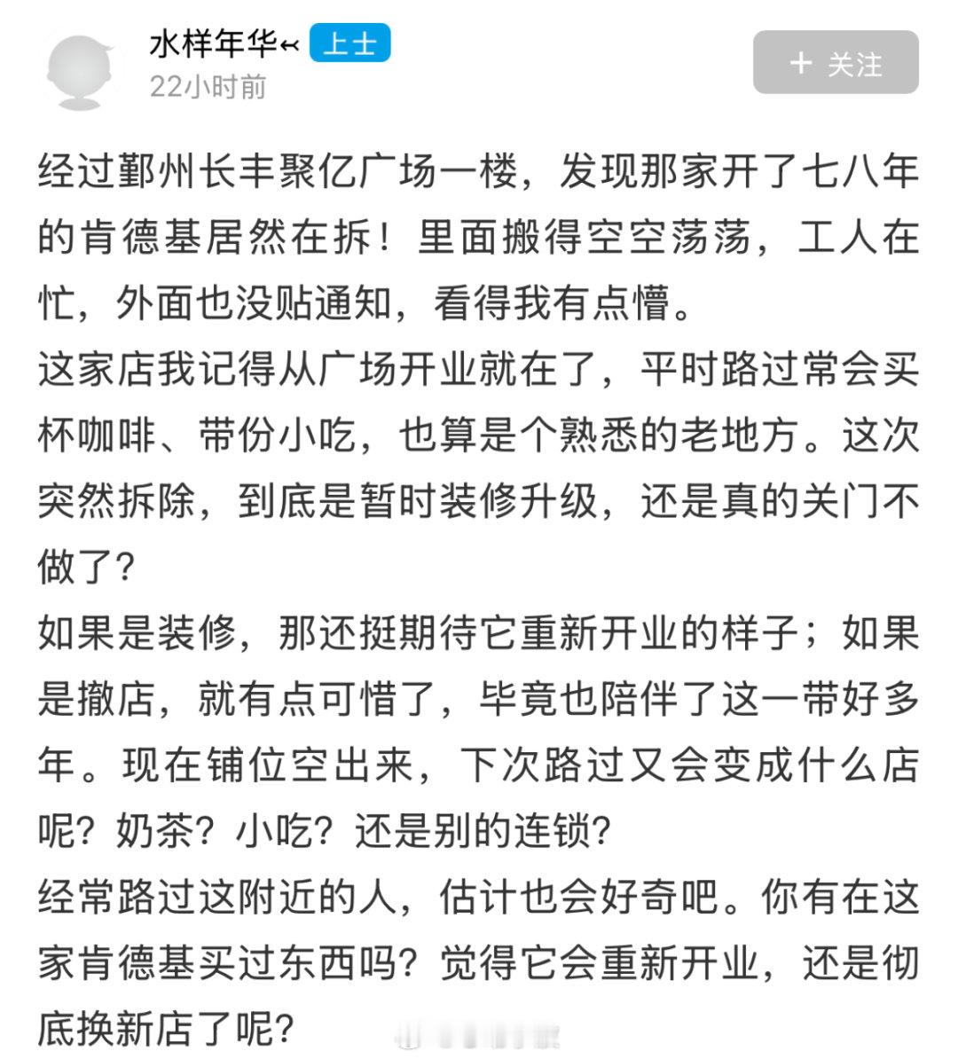 【开了七八年说拆就拆!宁波这家老牌肯德基突然搬空周围居民懵了 】近日,宁波鄞州长丰聚亿广场一楼开了七八年的老牌肯德基突然被拆空,店内设备已清空,工人们正开展拆除工作,店外却未张贴任何官方通知,让常光顾的居民和网友倍感困惑与惋惜。大家纷纷猜测其去向,部分网友认为门店生意不错,大概率是装修升级;也有网友担忧其永久关闭,还有人推测可能因租金问题导致撤店。从肯德基在宁波的布局来看,其近年动作频频:与地铁合作设便民早餐点,和美团“拼好饭”推出限定产品,开设“肯悦咖啡”门店并尝试无人机配送,还签约入驻新兴商业项目,且母公司计划2028年将门店扩至1.7万家以上。因此,该门店更可能是品牌优化升级的一部分。这家陪伴了周边居民多年的餐饮空间即将迎来变化,其最终走向及黄金铺位的新商户归属,仍有待揭晓。(东方热线)同城热点创作计划