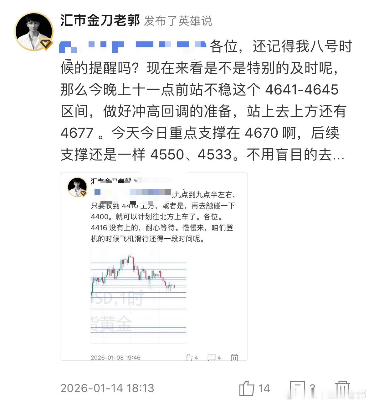 八号第一次提醒 4410 北上,到十四号,提示 4641 到南下,而昨天再次提醒,4623 为阻力的南下,每一次都恰到好处,三轮加一起,至少有三百点空间。第一次第二次保持观望那么第三次,不应该再有任何疑虑了吧。三百点是什么概念?按 1 手来算的话那就是 3 个达不溜。黄金