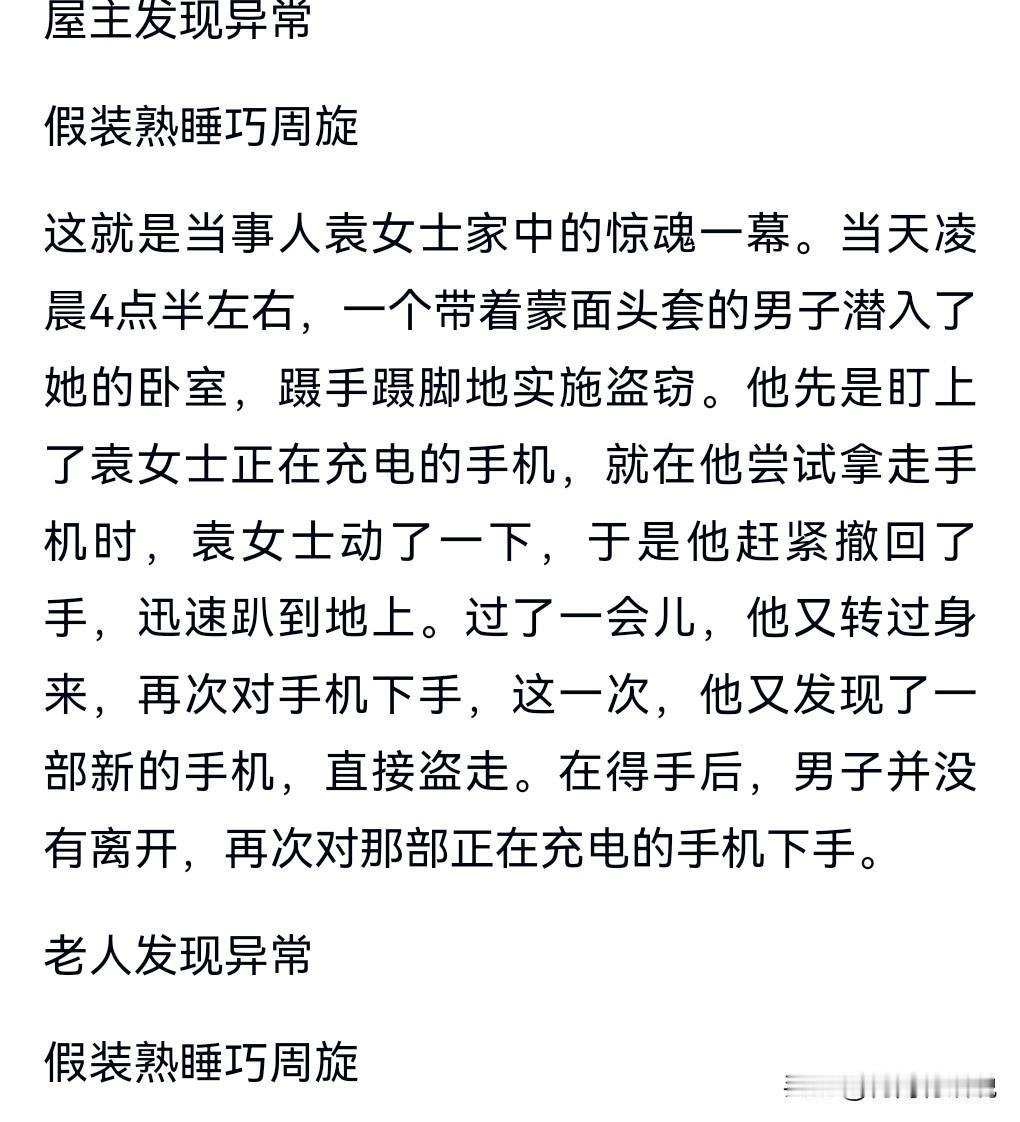 这个老人的行为是正确的,毕竟反抗肯定也反抗不过,如果被发现有可能还会遭到灭口。所以这个时候就假装睡着是最正确的行为。 1月17日网上报道这么一起案件。 盗贼溜进卧室行窃,老人假装熟睡避险。 虽然手机被盗了,但好歹没有生命危险。 小偷也最终被抓。 由于厅堂大门没有上锁,这才给小偷有了可乘之机,所以门一定要上锁。