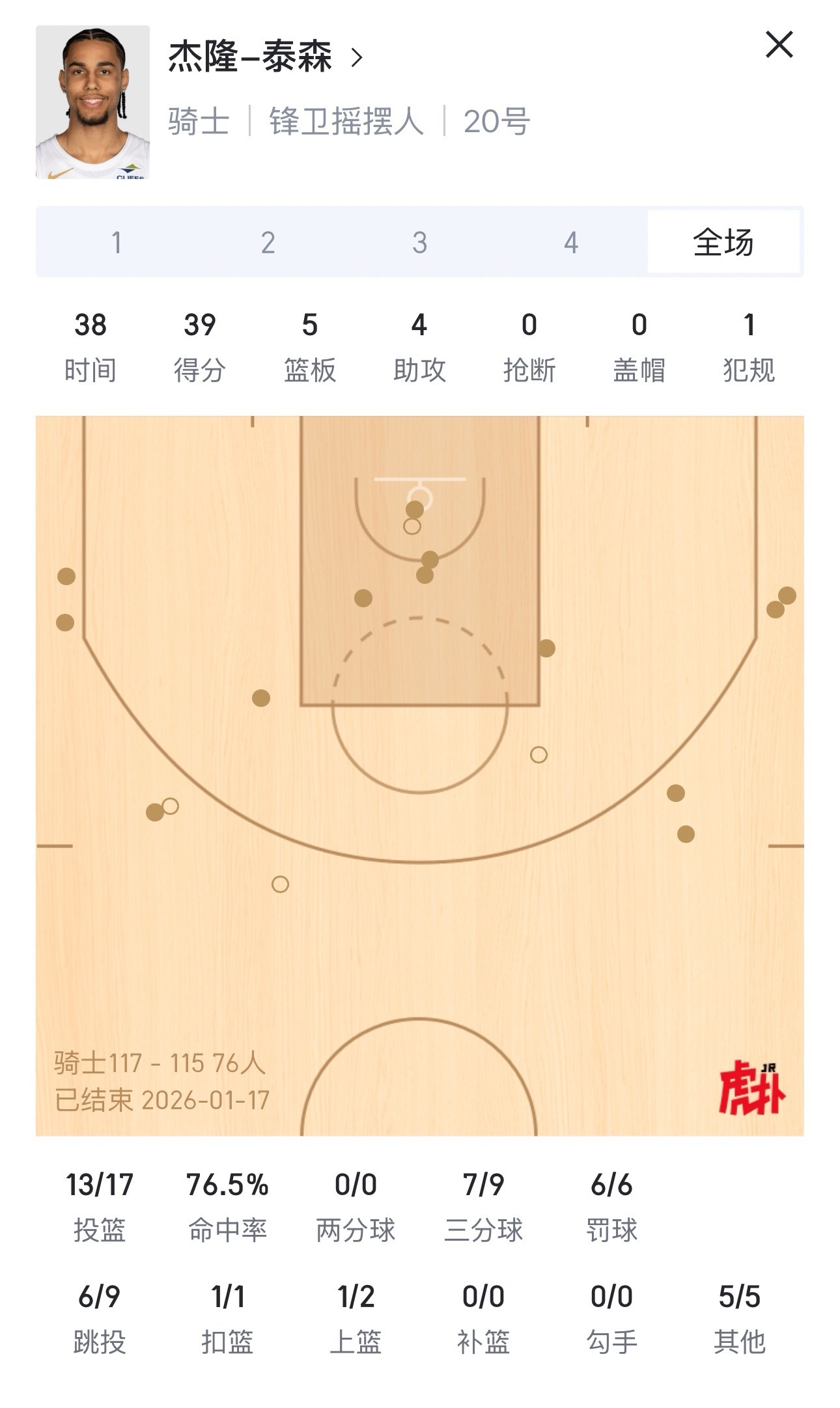 骑士锋卫摇摆人杰隆·泰森生涯之夜39分,帮助骑士客场险胜76人。23岁,1.98