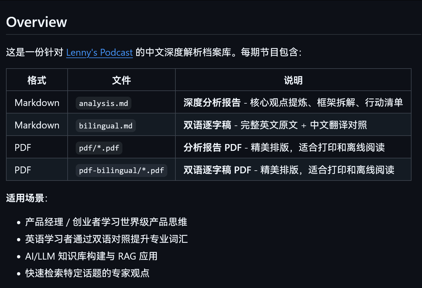 著名播客 Lenny's Podcast 的文字稿 (中英双语对照) 及AI分析整理。github.com/Penny777btc/lenny-podcast-chinese内有Markdown和PDF两种格式。 Lenny's Podcast 是目前全球科技、互联网和创业圈内最顶尖、影响力最大的播客之一,专注于产品管理、增长和职业发展。科技先锋官ai创造营