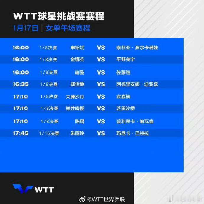 国乒多哈挑战赛1月17日赛程 今日全线出击!国乒10场关键战,从午后战至凌晨! 🔹 16:00|蒯曼 vs 佐藤瞳(日本)🔹 16:35|男单三将齐发:向鹏、温瑞博、周启豪🔹 17:10|黄友政、陈熠登场🔹 17:45|焦点对决:薛飞 vs 张本智和、 林诗栋 vs 奥恰洛夫🔹 18:20|混双半决赛:蒯曼/陈垣宇 vs 韩国组合🔹 22:00起|单打1/4决赛(对阵待定)🔹 00:55(+1)|男双决赛:黄友政/温瑞博 vs 韩国强档乒出精彩