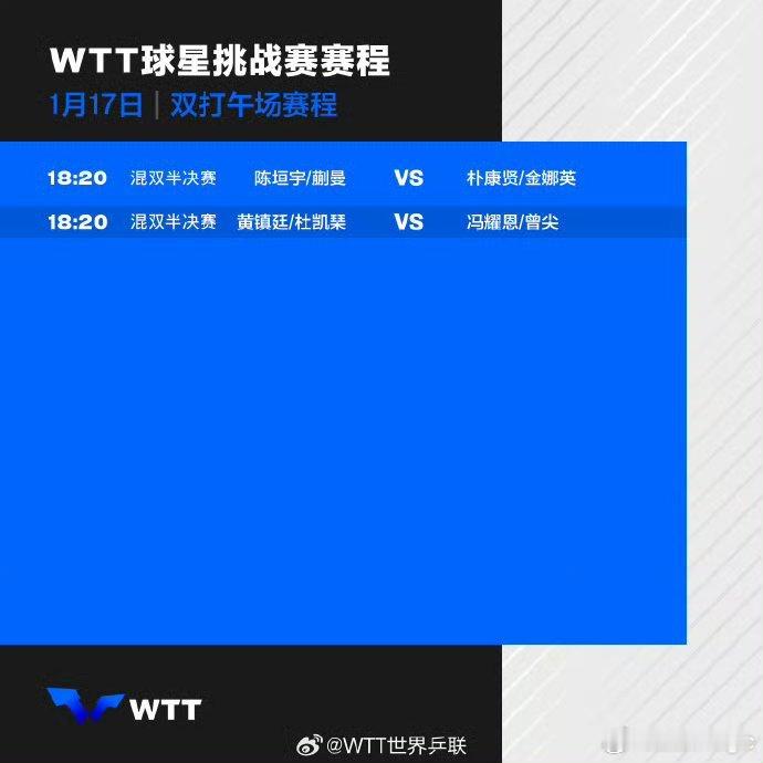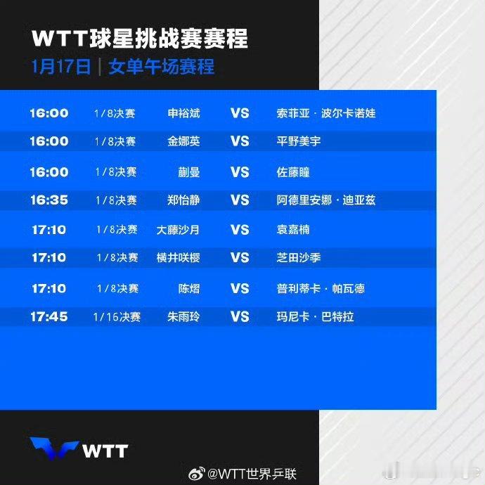 国乒多哈挑战赛1月17日赛程16:00 蒯曼vs佐藤瞳16:35 向鹏vs西蒙·高茨16:35 温瑞博vs安德斯·林德16:35 周启豪vs篠塚大登17:10 黄友政vs郭冠宏17:10 陈熠vs普莉蒂卡·帕瓦德17:45 薛飞vs张本智和17:45 林诗栋vs迪米特里·奥恰洛夫18:20 蒯曼/陈垣宇vs金娜英/朴康贤22:00 男单、女单1/4决赛00:55(+1)男双决赛 黄友政/温瑞博vs张禹珍/赵大成WTT球星挑战赛多哈站2026
