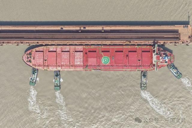 为保障船舶安全高效进港及周转,宝武资源所属嵊泗宝捷充分发挥口岸协调优势,提前与海关、边检、海事等联检单位开展深度沟通,海事、海关、边检等口岸单位启动联合登临检查,实现船舶到港“零延迟查验”“零等待作业”,通过海事航道清障巡逻艇全程护航、海关优化监管模式及无人机送样、边检优化勤务组织方案线上通关等多重举措无缝衔接,全力保障货物快速通关及企业供应链安全畅通稳定。货轮稳泊后,红褐色的铁矿石将被卸船机高效抓取,再经由传送带卸货至堆取料场。第一时间完成卸货工作后,首船海进江2.4万吨铁矿石,将由宝武资源自有船舶“宝航16轮”运往宝钢股份宝山基地。