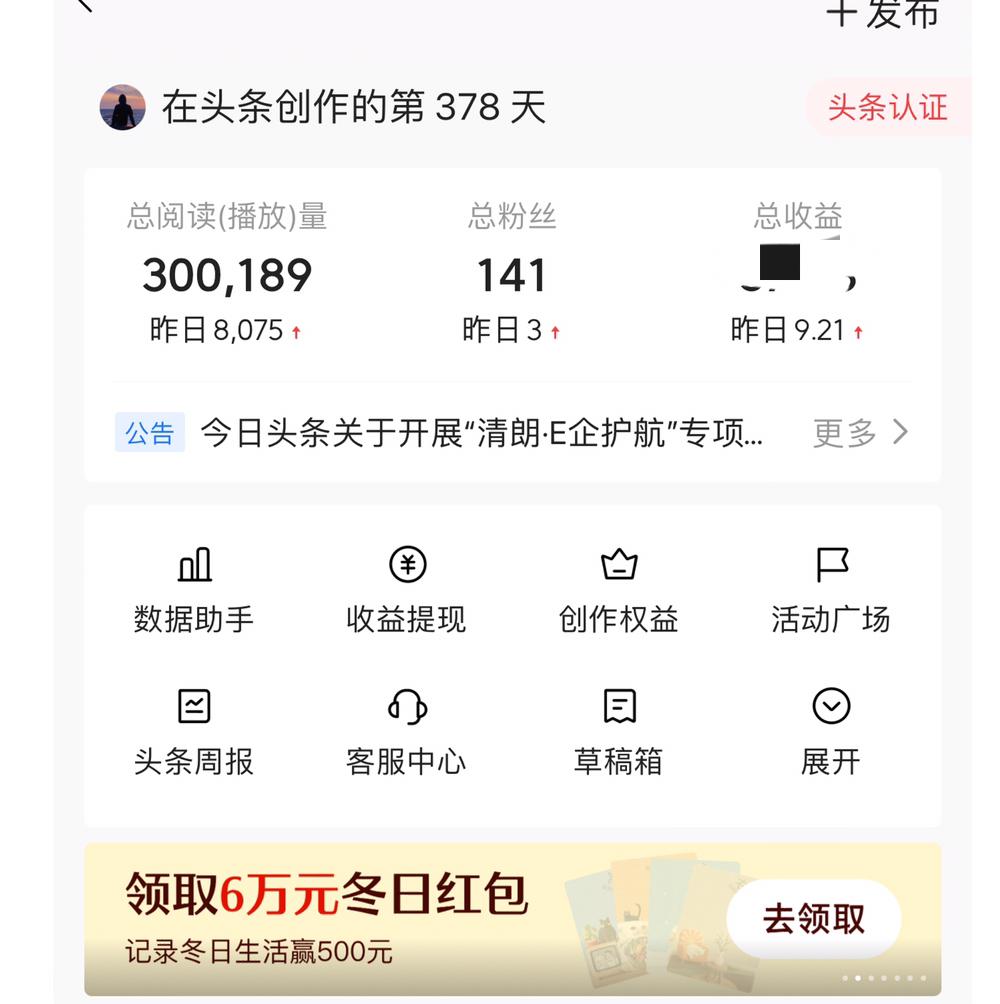 看了我的收益,你还想继续做自媒体吗? 昨天8075的阅读量,收益是只有9.21元,这样的收入真的很不稳定。 从我的收益里面可以看到一个规律,只有保持每天优质内容的输出, 平台才会记得你,而不是三天打鱼,两天晒网,所以还是要保持好心态,不要太过纠结具体收益多少! 要调整好心态,这个收益不是上升和下降,每天都是开盲盒一样,充满期待,但又像过山车一样,高的时候兴奋,低的时候感觉有点失落。 如果急于赚钱的人,想赚快钱,劝劝你这行真的不适合你,因为这是一份没有保证的活,而是作为茶余饭后的兼职,但同时也应该调整好心态,因为写了就肯定有收入,只是多少的问题。 但大家也要想,本来就是数字为0的,但现在因为你写了,得到了平台的青睐,有时候可能会有意外的收获啊! 所以个人的看法是,多劳未必多得,但不劳而获是绝对不可能的。
