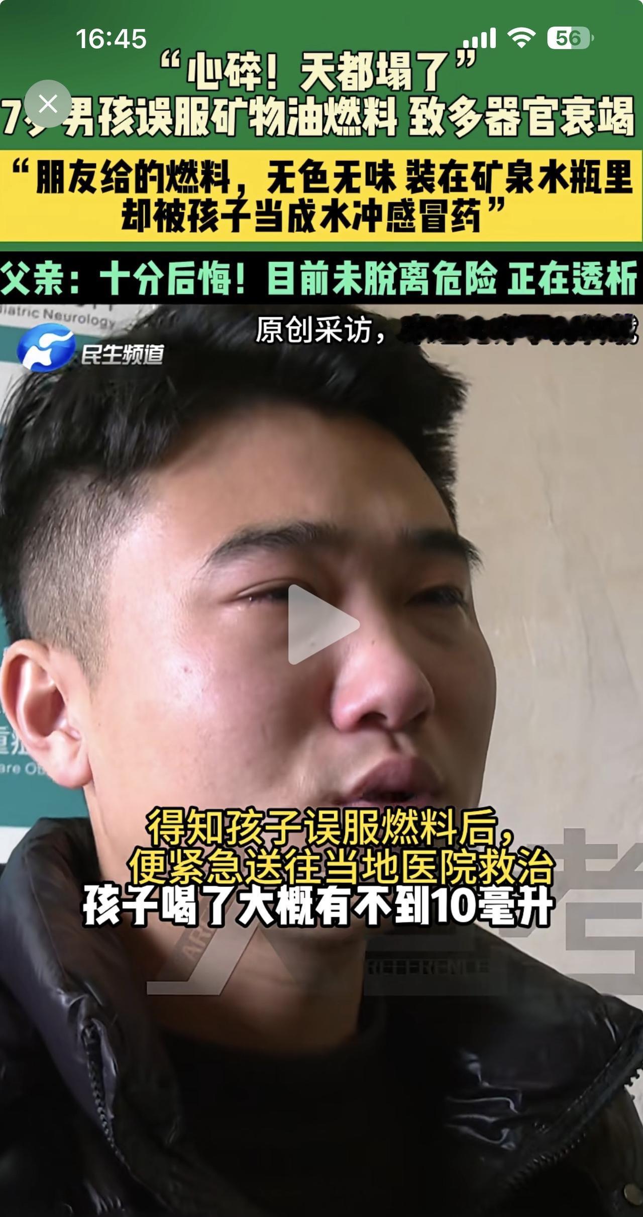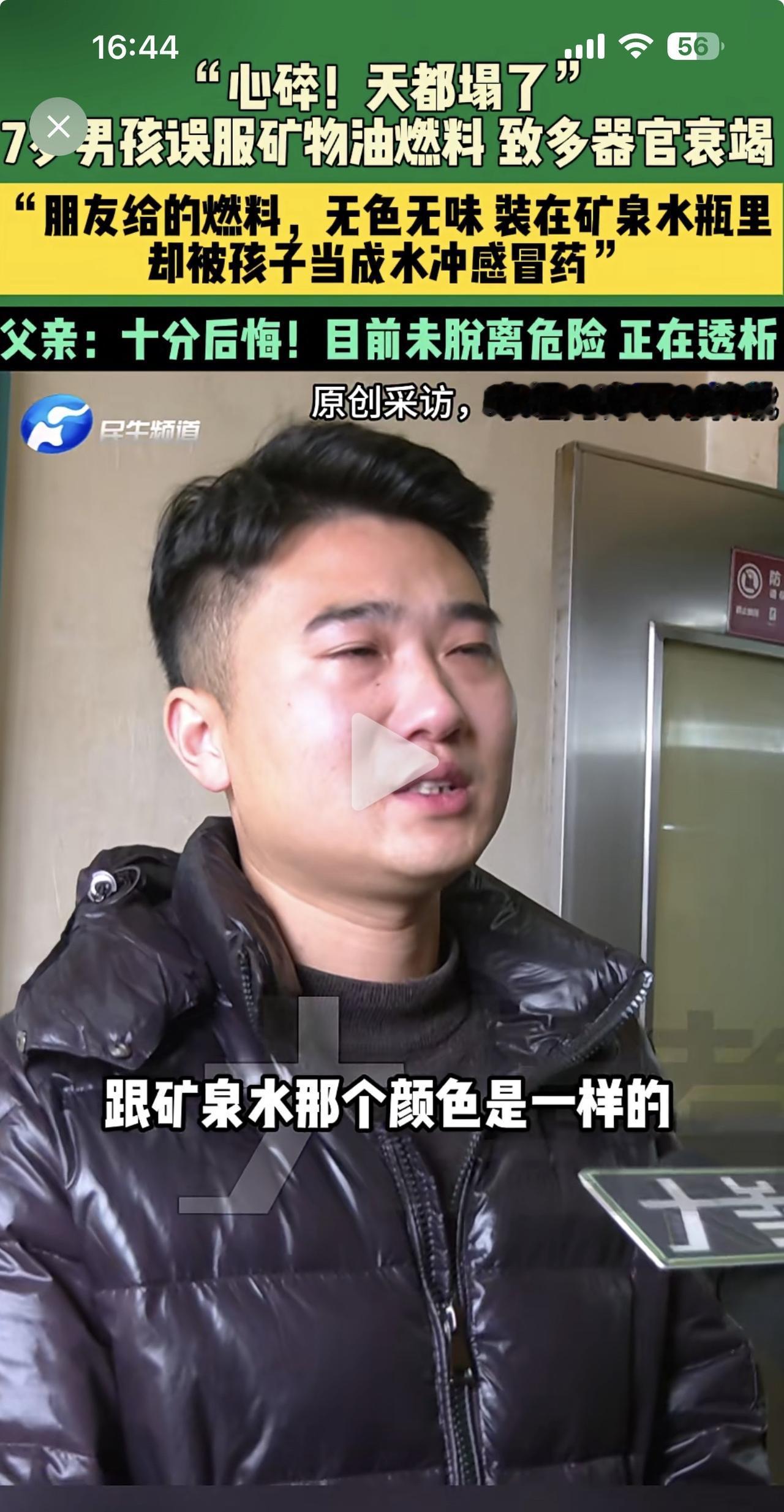 这个孩子好无辜!误食矿物油燃料导致命悬一线! 作为孩子父亲,你犯了一个遗憾终生的错误,有毒有害物质怎么能放在孩子够得着的地方?现在痛哭流涕有什么用呢? 这起悲剧事件再次提醒了那些大大咧咧的家长们,你们随意乱扔乱放药品,有毒有害物质,那就是在为家人挖坑。