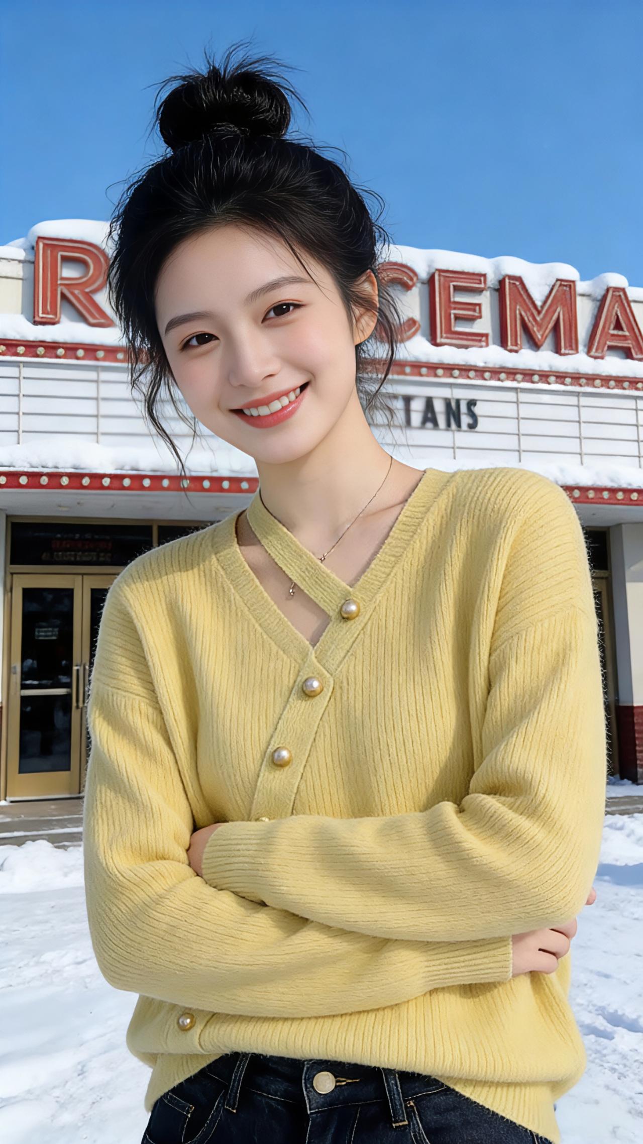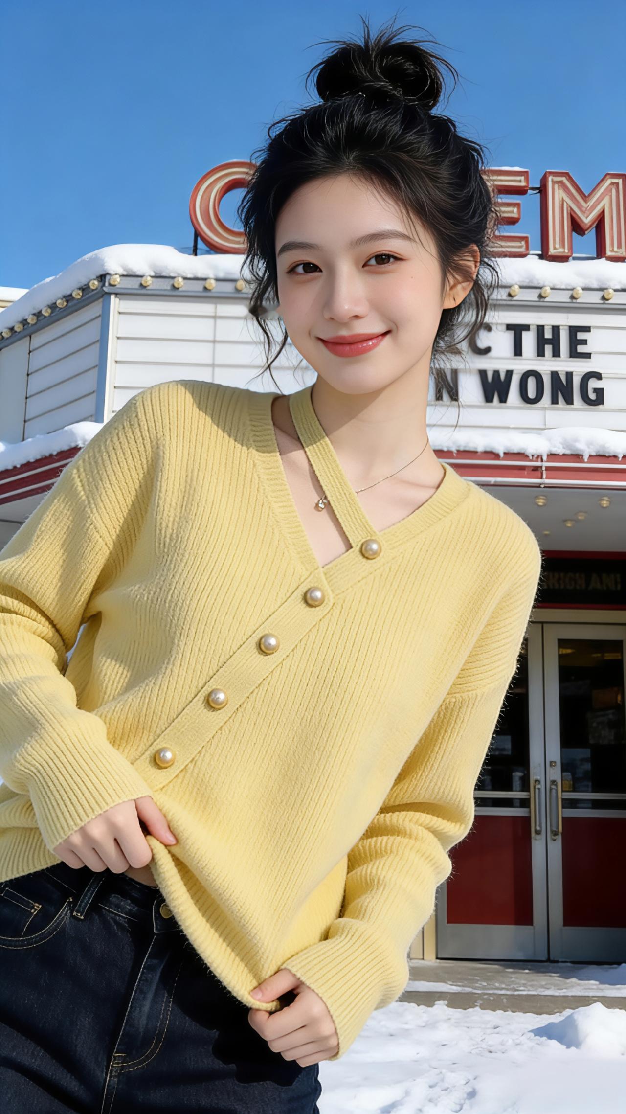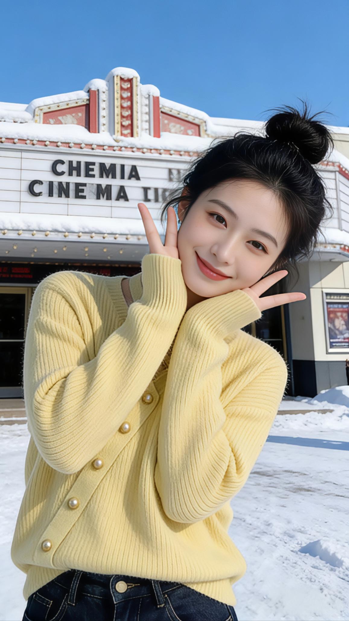 我会根据这组冬日街拍,为你创作一篇散文。 雪色檐角的浅黄诗篇 这场雪把小镇揉成了一张复古明信片,老影院的红漆招牌顶着蓬松的积雪,在澄澈蓝天的衬里下像一块融化的水果硬糖。我裹着这件鹅黄色毛衣站在雪地里,像是不小心从春日里跑出来的风,把暖意织进了这片白色天地。 指尖轻轻抵在毛衣领口,珍珠纽扣在雪光里泛着温润的光,斜襟的设计让规整的针织多了几分松弛的俏皮。牛仔裤的深色和毛衣的暖黄撞出温柔的层次感,我把半只手揣进裤兜,看着雪粒在阳光里簌簌发亮,身后影院的门推开时,带着焦糖爆米花香气的热气漫出来,和清冽的雪气缠在一起。 我抬手比出剪刀手贴在脸颊,发梢沾了细碎的雪粒也不在意,风掠过耳尖时,把毛衣领口的绒毛吹得轻轻晃动。老影院的字母招牌在雪层里露出半截,像是旧电影里没说完的台词,而我站在这帧画面里,把浅黄的温柔揉进了冬日的风里。 后来我抱着手臂站在街角,看着雪落在影院的红色檐角,毛衣把阳光的温度锁在针织纹路里,每一缕毛线都裹着这个雪天的甜。我轻轻扯了扯毛衣下摆,把影子踩在雪地里,和身后的老影院一起,成为了这个冬天最鲜活的注脚。高级感穿搭 新年穿搭 冬季穿搭 针织衫