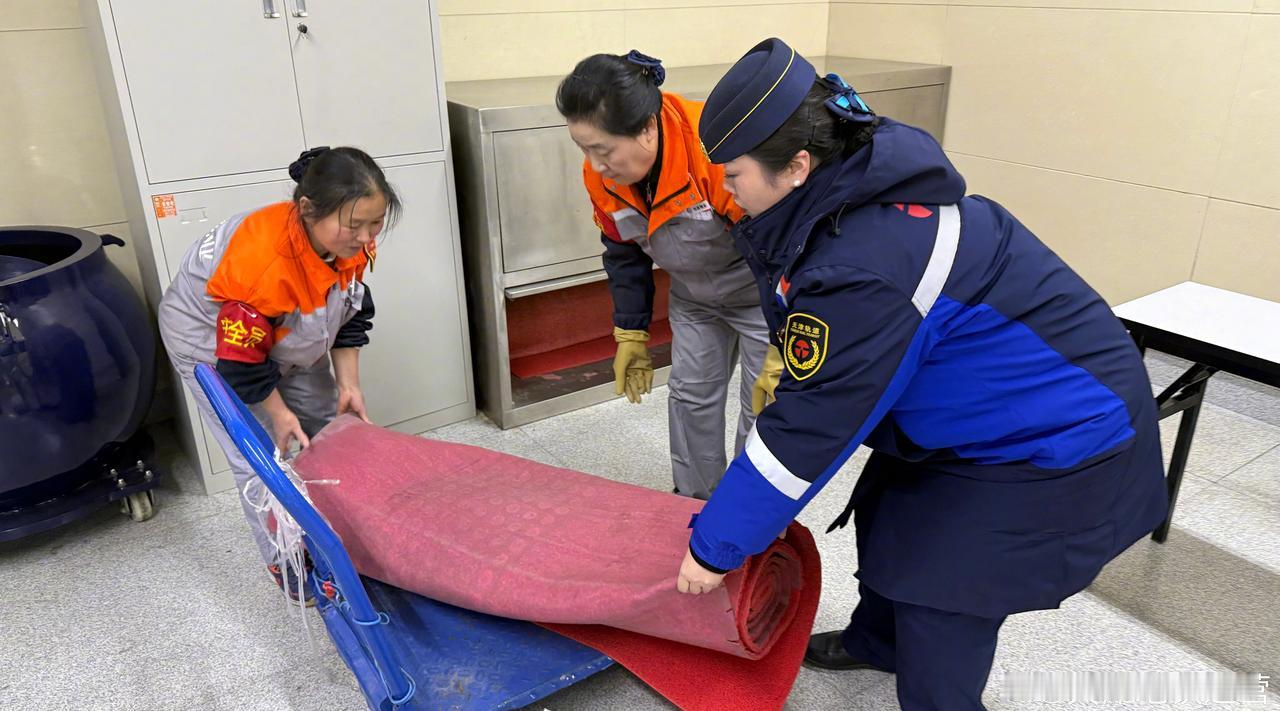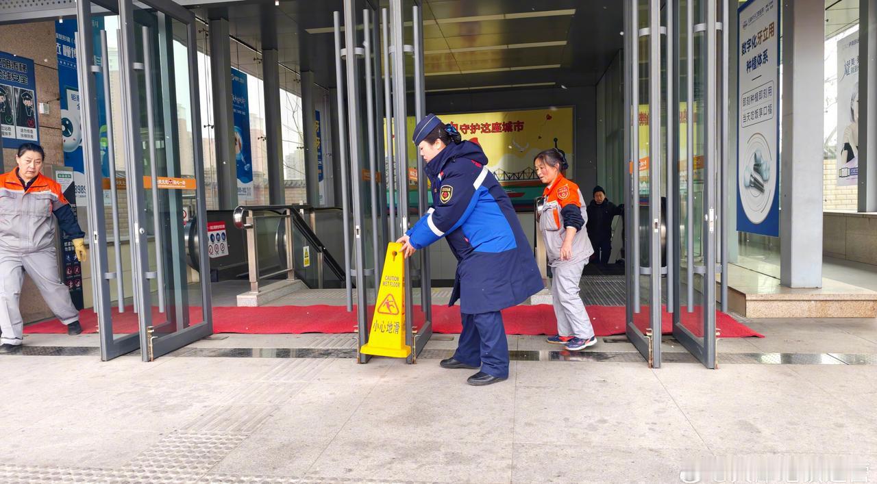 降雪持续!车站各岗位人员加强出入口及站台巡视,在出入口及站厅通道铺设防滑垫,在站外乘客通行的地面铺撒融雪盐。快捷无忧,贴心一路,天津地铁永远为乘客的安全出行,保驾护航!