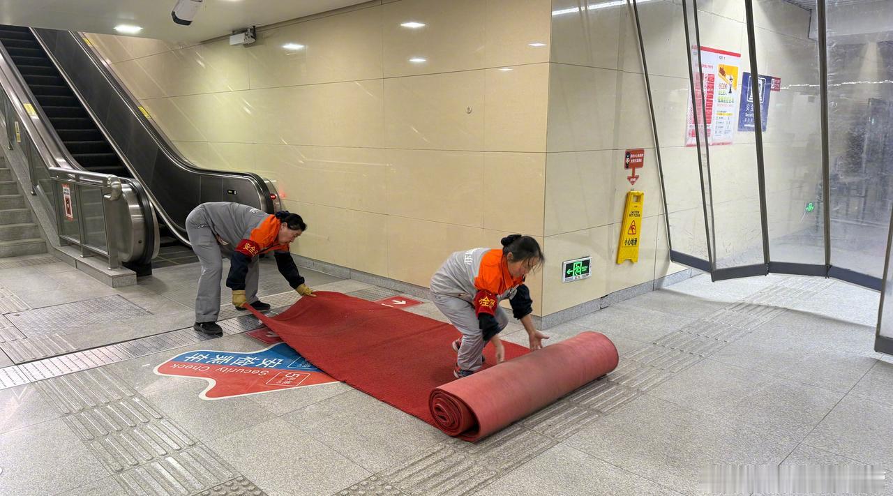 降雪持续!车站各岗位人员加强出入口及站台巡视,在出入口及站厅通道铺设防滑垫,在站