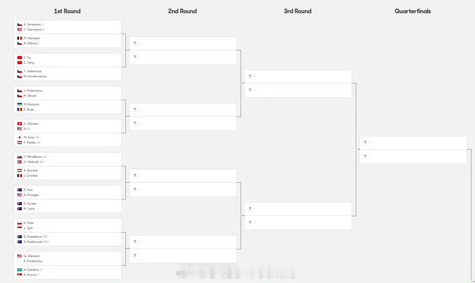 小花小草资讯 【2026澳网】女双签表张帅🇨🇳/梅尔滕斯🇧🇪 vs 科斯蒂亚🇷🇴/卡琳斯卡娅🇷🇺徐一璠🇨🇳/杨钊煊🇨🇳 vs 瓦伦托娃🇨🇿/万卓索娃🇨🇿蒋欣玗🇨🇳/詹皓晴 vs 布林科娃🇷🇺/拉希莫娃🇺🇿郭涵煜🇨🇳/梅拉德诺维奇🇫🇷 vs 帕克斯🇺🇸/雅斯特雷姆斯卡🇺🇦王欣瑜🇨🇳/郑赛赛🇨🇳 vs 卡布雷拉🇦🇺/普雷斯顿🇦🇺汤千慧🇨🇳/拉姆斯登🇬🇧 vs 埃拉尼🇮🇹/保利尼🇮🇹这很澳网