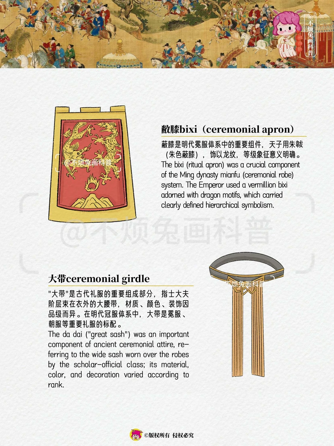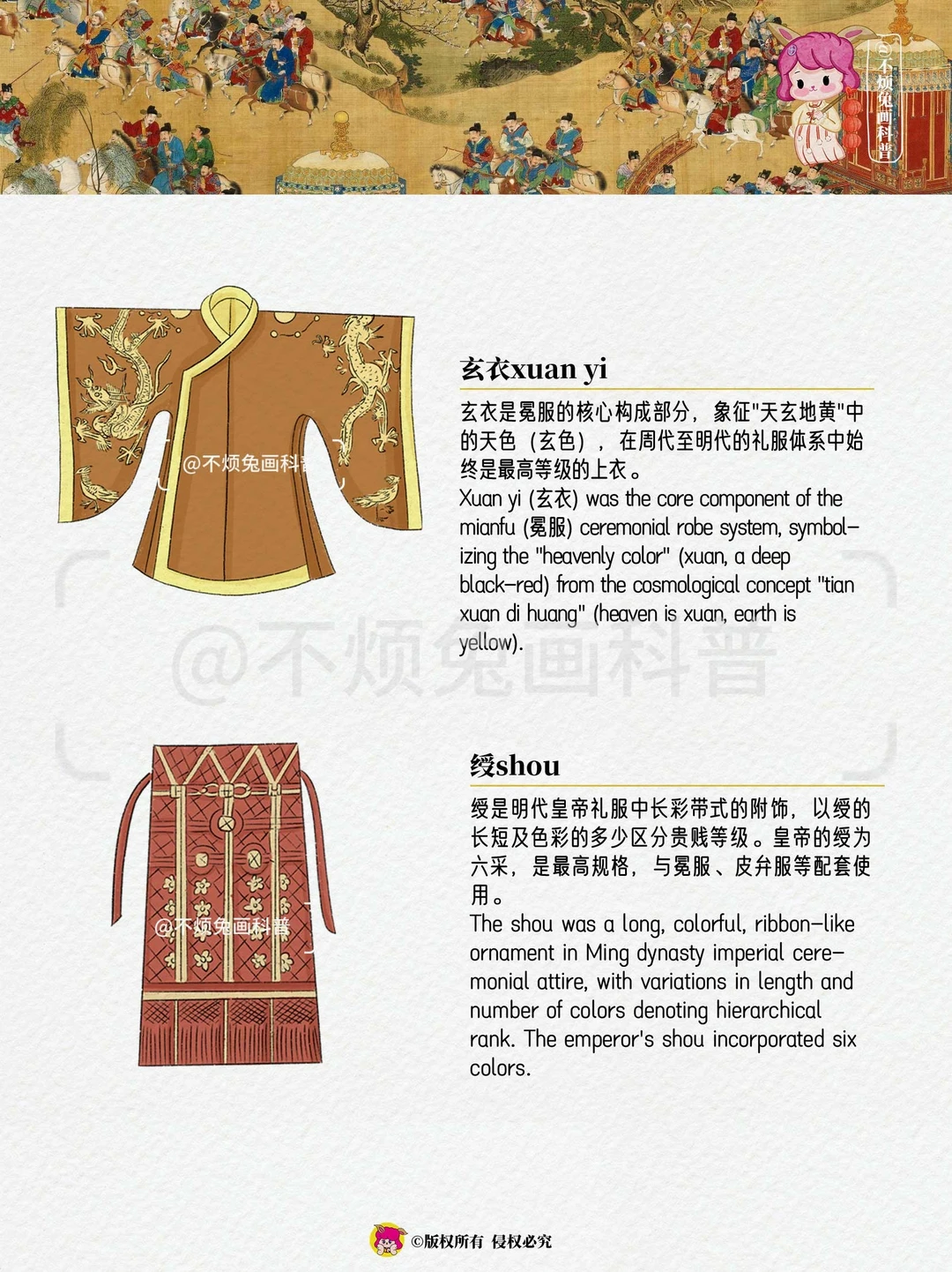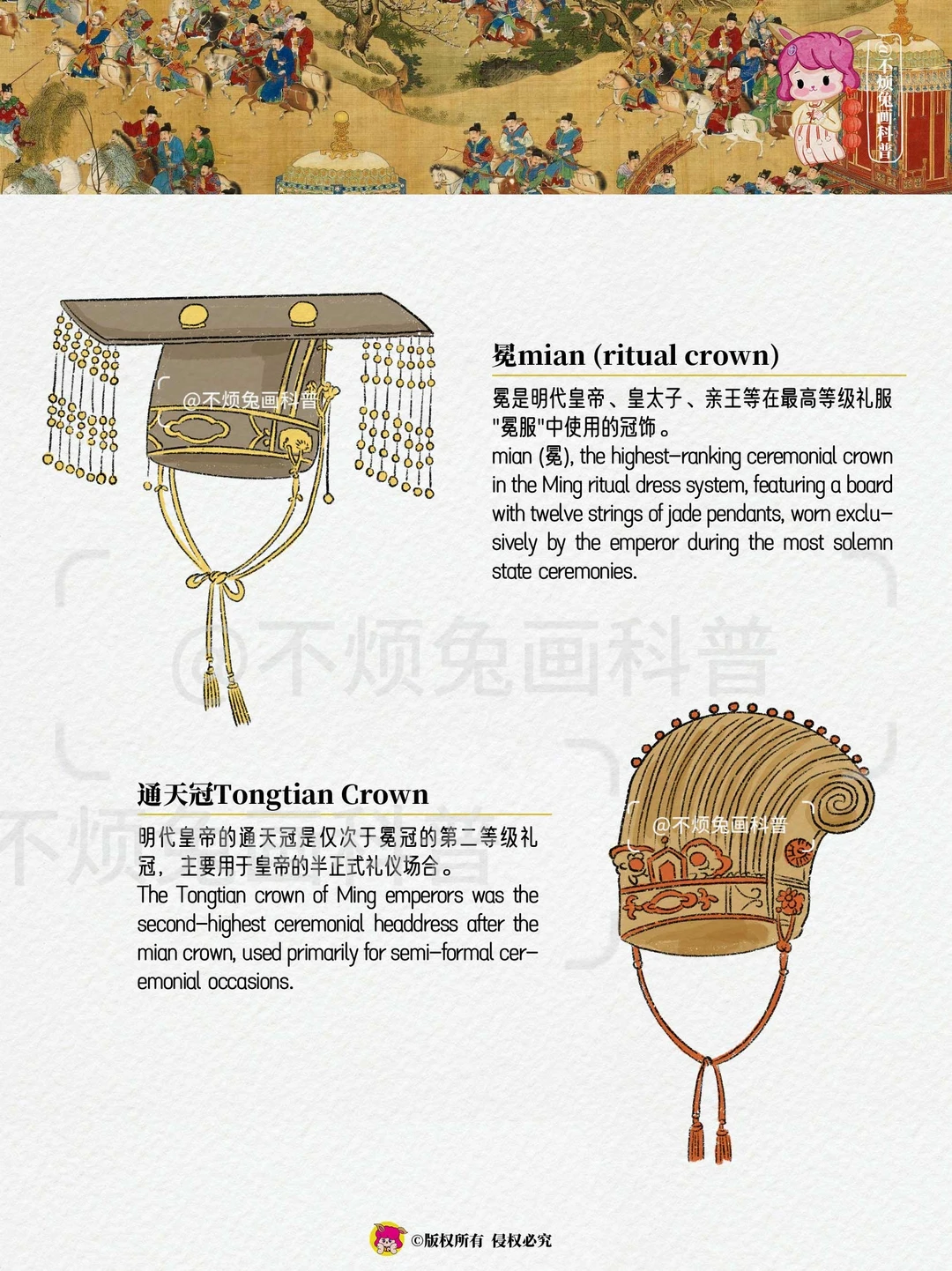 ♦️《三才图会》以"图绘"与"文字"并重的体例,收录了明代皇帝冠服的等级规制与形制细节。书中所载冠服体系森严繁复,分为衮冕、通天冠服、皮弁服、燕弁服等十五个级别。今天和不烦兔一起来看看吧,图中根据《三才图会》还原,欢迎大家一起讨论哦!