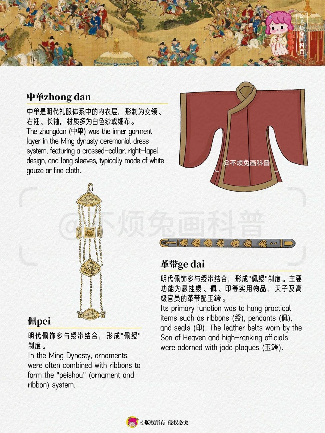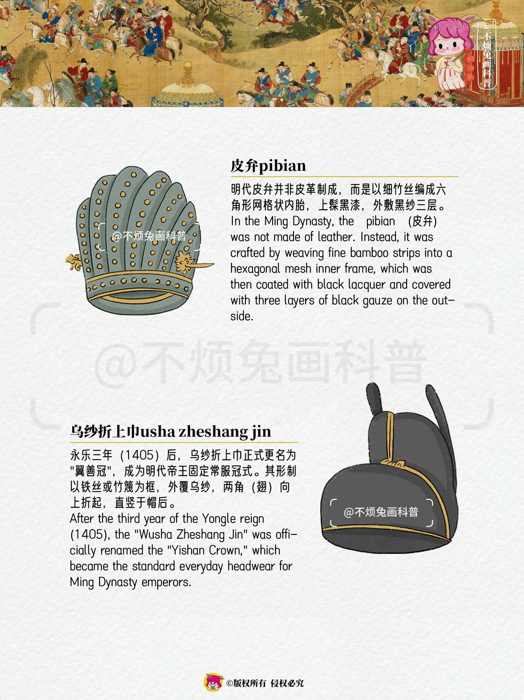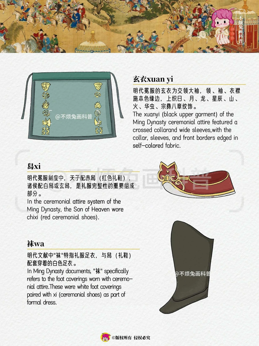 ♦️《三才图会》以"图绘"与"文字"并重的体例,收录了明代皇帝冠服的等级规制与形制细节。书中所载冠服体系森严繁复,分为衮冕、通天冠服、皮弁服、燕弁服等十五个级别。今天和不烦兔一起来看看吧,图中根据《三才图会》还原,欢迎大家一起讨论哦!
