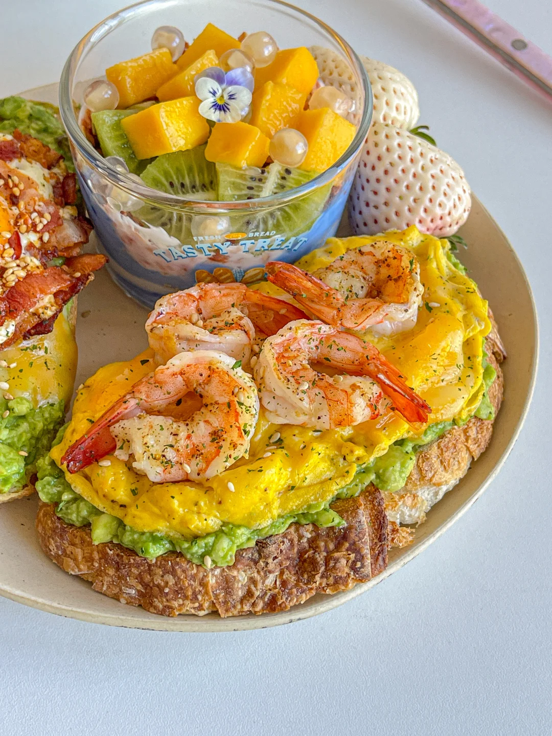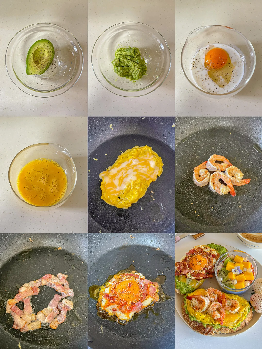 又幸福了😌给老己做的漂亮饭✨ 欧包三明治搭配酸奶杯和热拿铁☕️ 食材:🥖 欧包➕牛油果➕芝士滑蛋➕虾仁 欧包➕牛油果➕芝士➕油泼辣子培根煎蛋 希腊酸奶➕烘焙麦片➕芒果➕奇异果➕马蹄珠珠➕草莓 步骤:🥣 1.牛油果用黑椒海盐 几滴柠檬汁捣碎备用 2.鸡蛋加入少量黑椒海盐 牛奶搅拌均匀 小火滑熟 放入芝士片 盖上锅盖焖至芝士融化 3.虾仁用黑椒 海盐调味煎熟 培根切碎煎至焦黄 打入鸡蛋再来一点油泼辣子提味 准备好的食材组装在欧包上即可 爱你老己[派对R]漂亮饭治愈一切!每天都要吃好喝好[亲一个R]