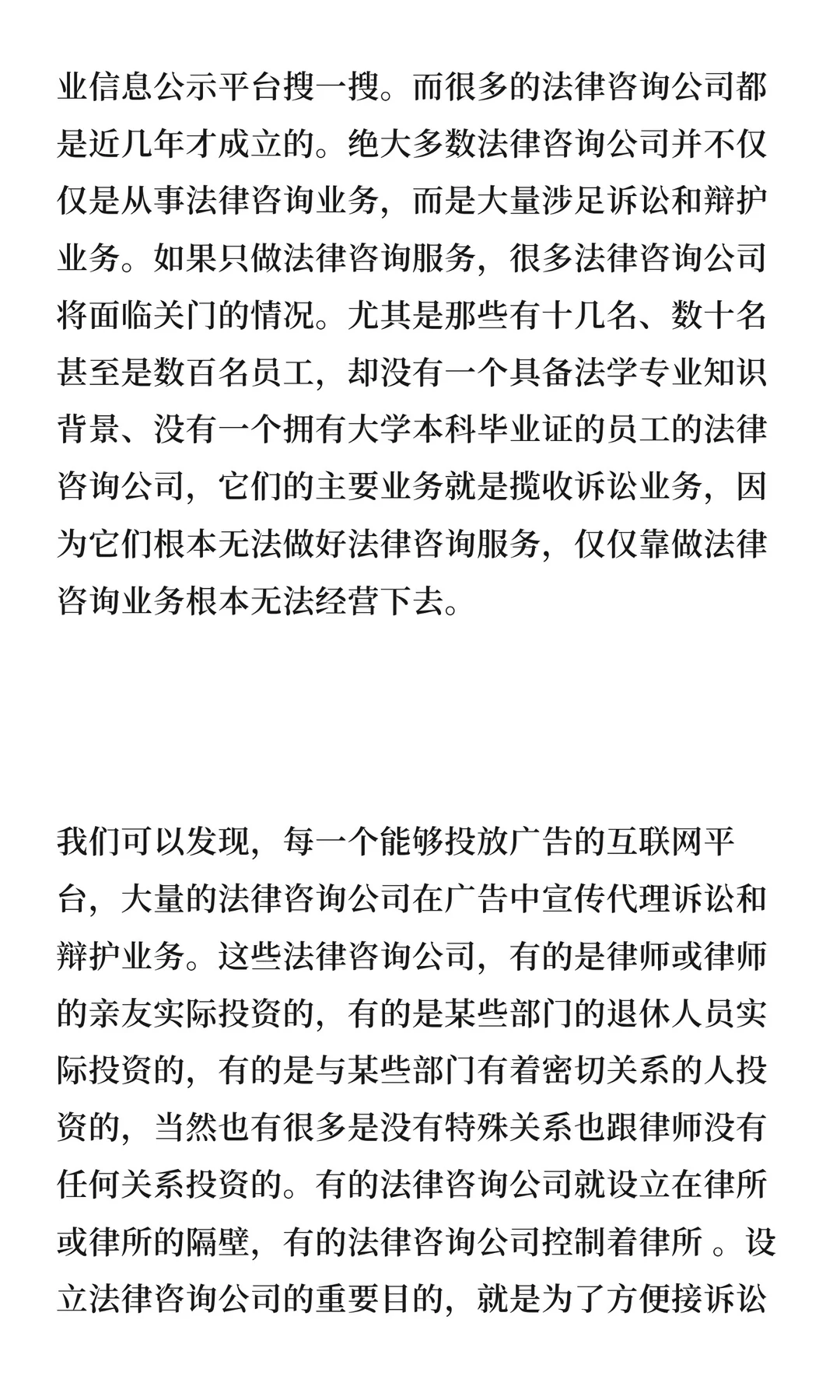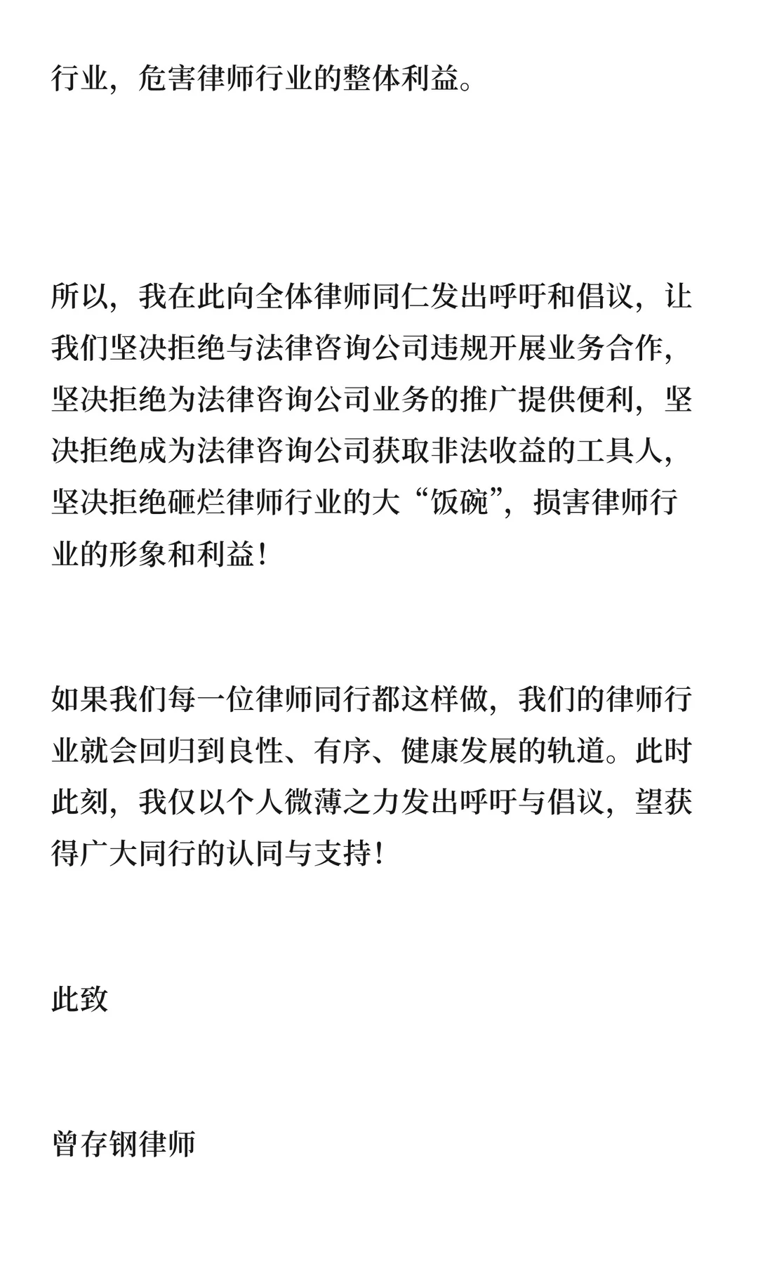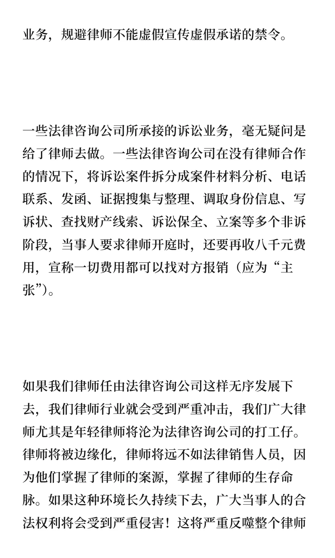 面对法律咨询公司违规操作和行业乱象,我呼吁律师同行坚决拒绝与法律咨询公司合作,维护律师行业利益。我们应回归良性发展,保护当事人权益,确保律师行业健康有序。