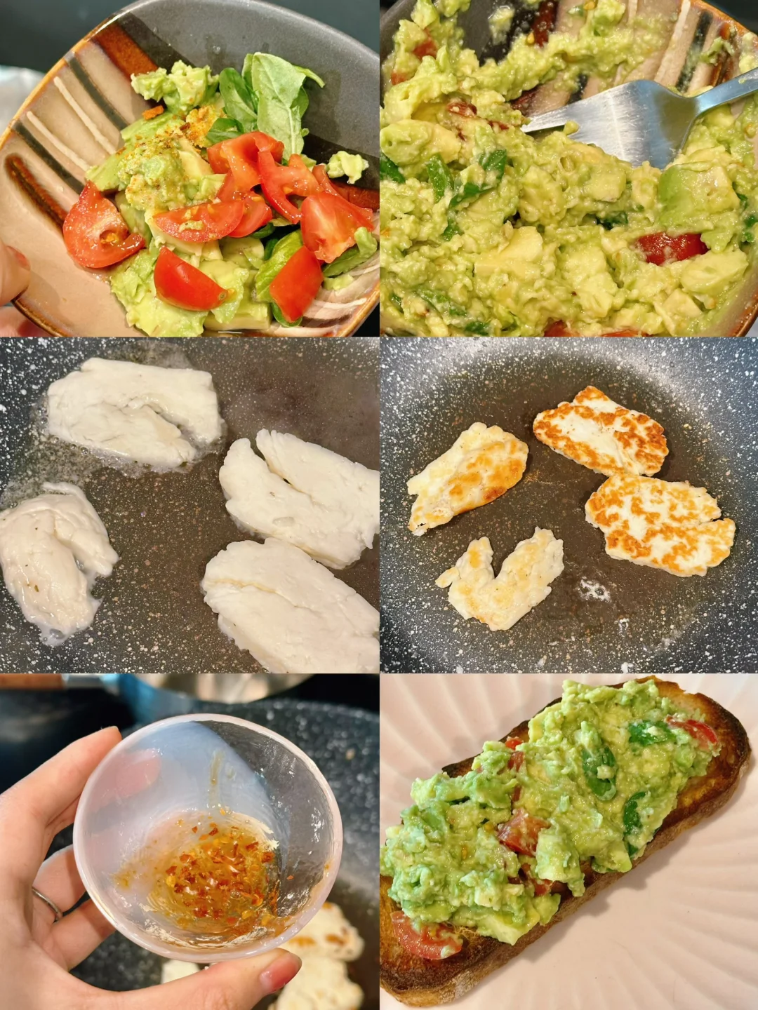 牛油果加入柠檬汁,黑胡椒捣碎成泥,我还加了点番茄和罗勒,更清香;