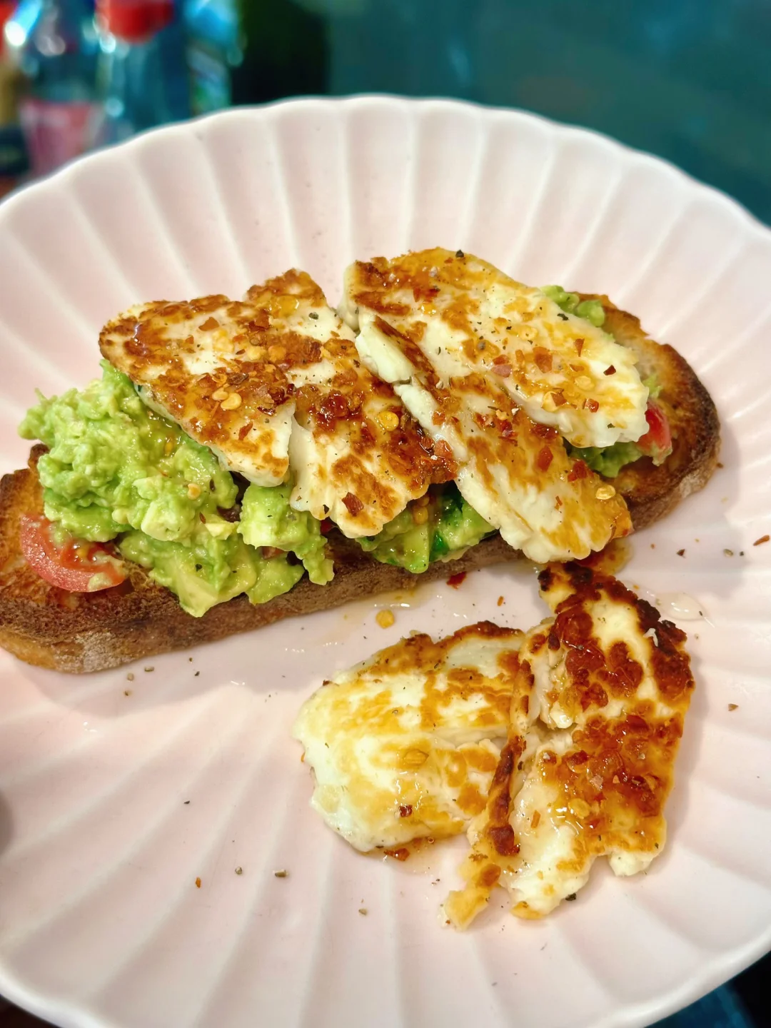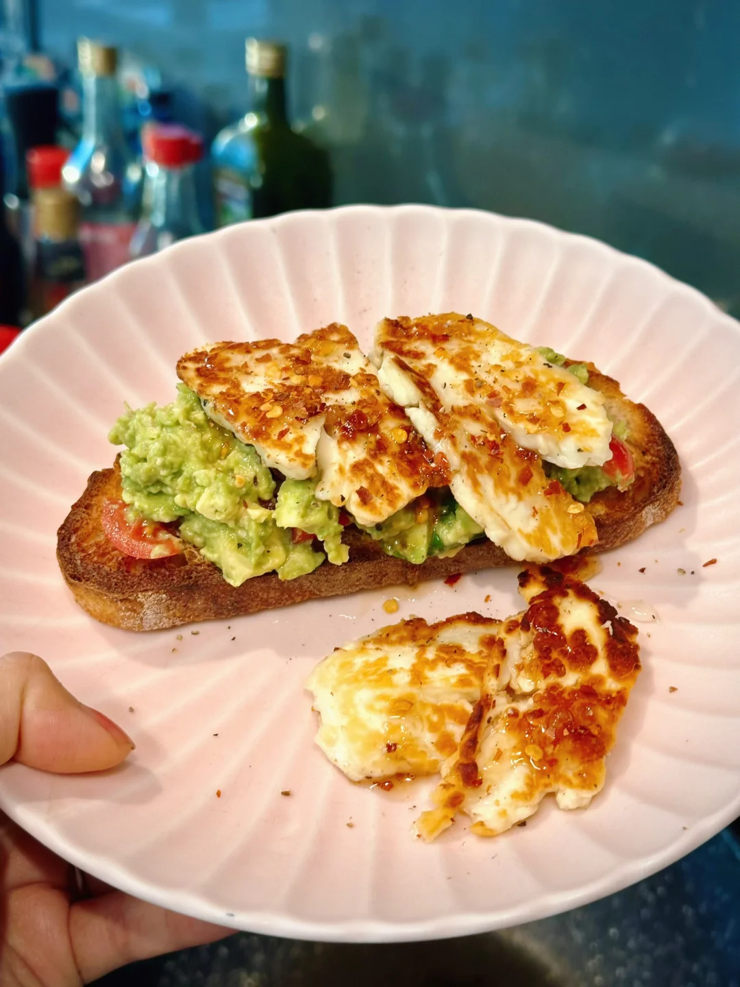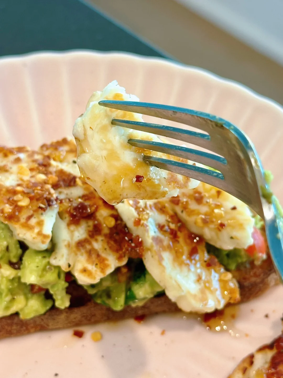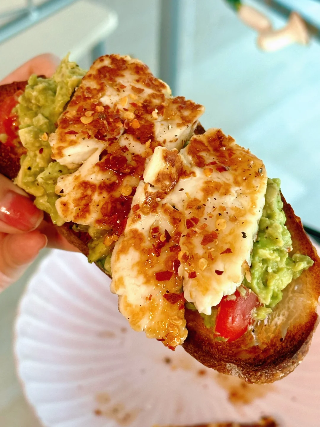 酸面包烤热,抹上牛油果,盖上奶酪,再淋辣蜂蜜,就完成了!趁热吃味道最好!
