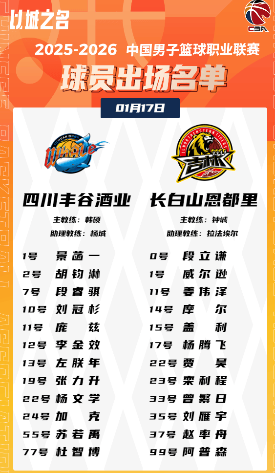 虎扑01月17日讯今日CBA常规赛,四川对阵吉林的大名单已经公布。