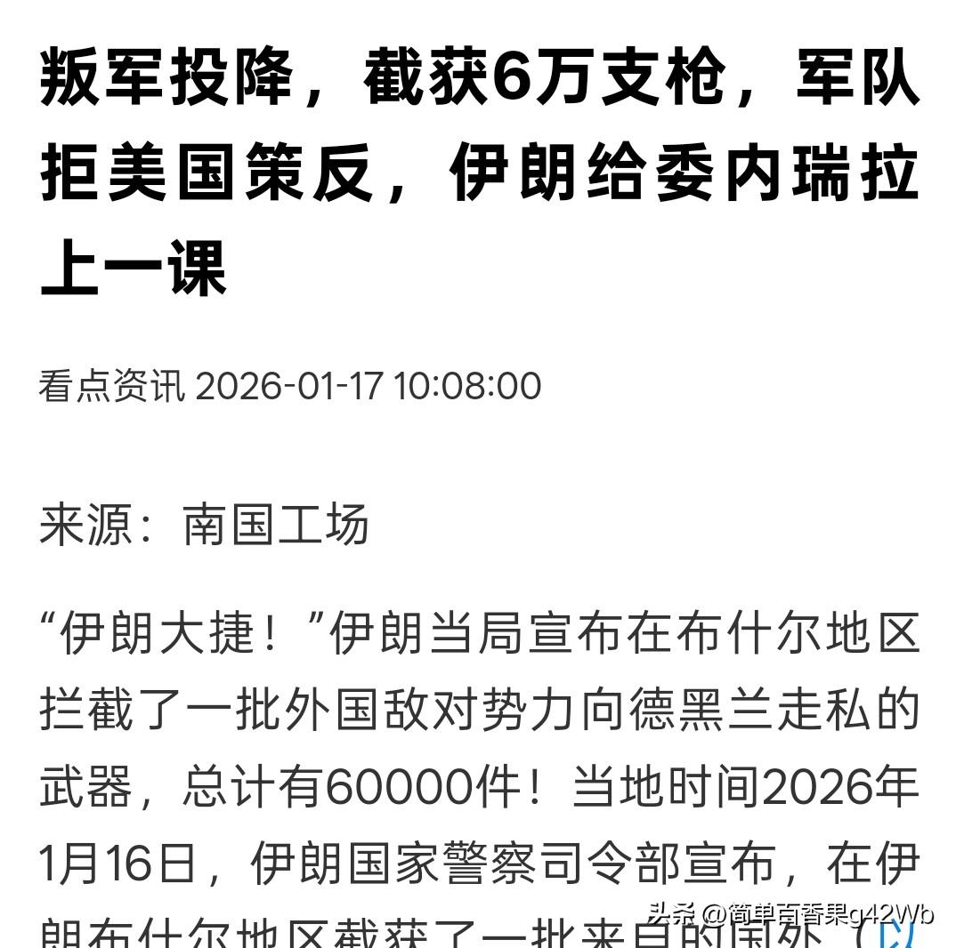 50吨军火被截!伊朗斩断CIA-摩萨德渗透网,美以阴谋落空 2026年1月中旬,伊朗南部布什尔省破获一起大规模武器走私案,查获枪械、弹药和通信设备超50吨,原计划武装数千人搞乱国内局势。 美军无人机曾多次在边境侦察,疑似为运输提供导航。武器种类齐全,连燃烧弹和大刀都有,明显不是普通走私,而是有组织的渗透行动。 情报显示,CIA和摩萨德联手策划,用金钱激励袭击警察局和军车,还在社交媒体发波斯语帖子煽动骚乱。但伊朗早有防备,革命卫队联合警察多地同步收网,直接打断外部黑手。 伊朗断网近一个月,切断远程操控信号,同时靠百万巴斯基民兵盯住街头巷尾,连小城检查站都能发现可疑人员。 美国本想复制利比亚那一套,结果发现根本玩不转。自家导弹拦截弹库存太少,一场高强度战争都撑不过几天,只好放弃直接动手。 现在他们改走低成本路线,想用内耗拖垮伊朗。可这招也不容易见效,毕竟体制没崩,社会也稳得住。 战争没停,只是看不见硝烟。 伊朗断网 伊朗 美国