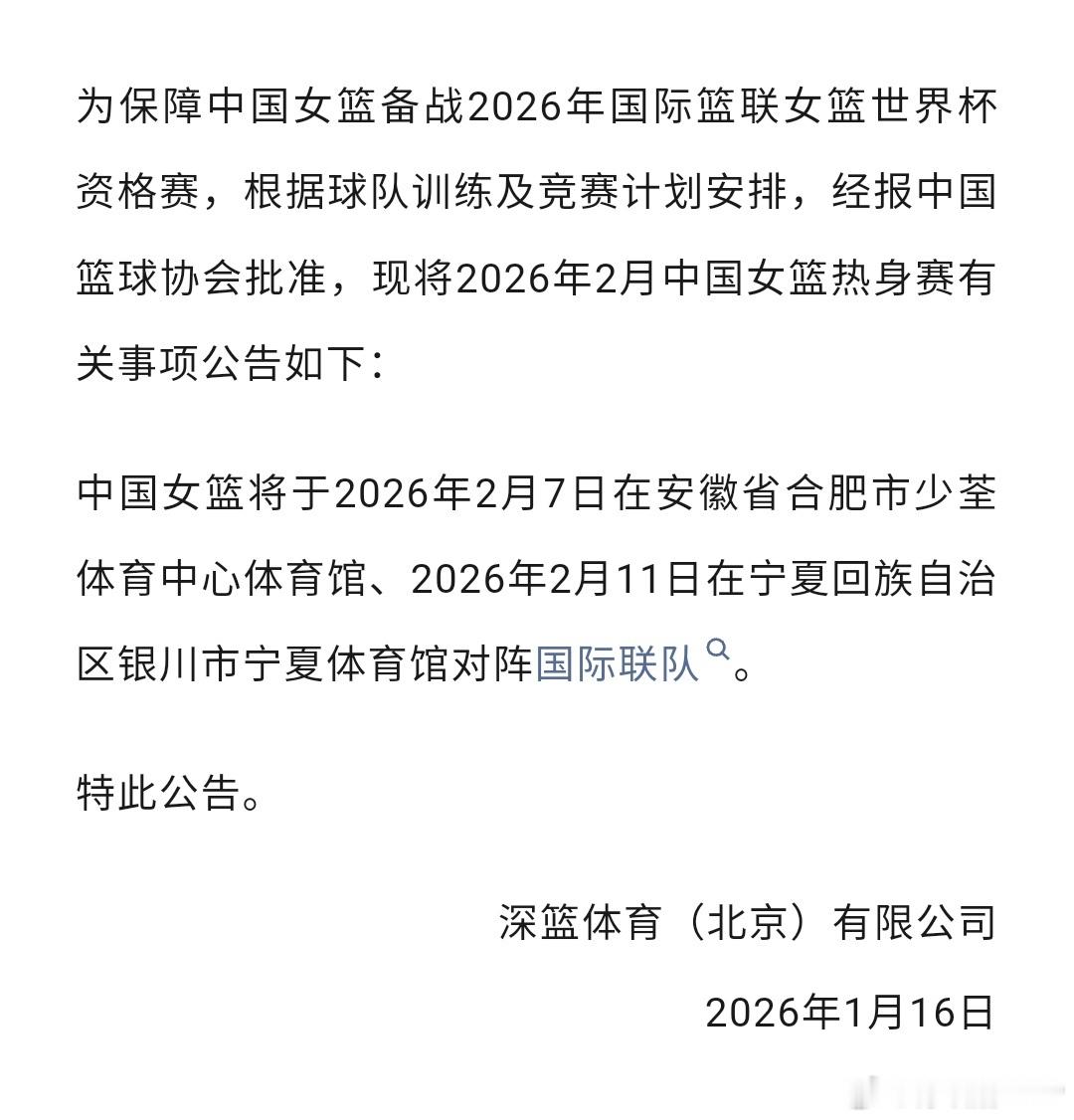 中国女篮将先后于2月7日在安徽合肥市、2月11日在宁夏银川市参加热身赛,对手为国际联队。我看宁夏体育局公示的采购信息是以80万元价格向深篮体育采购中国女篮热身赛。