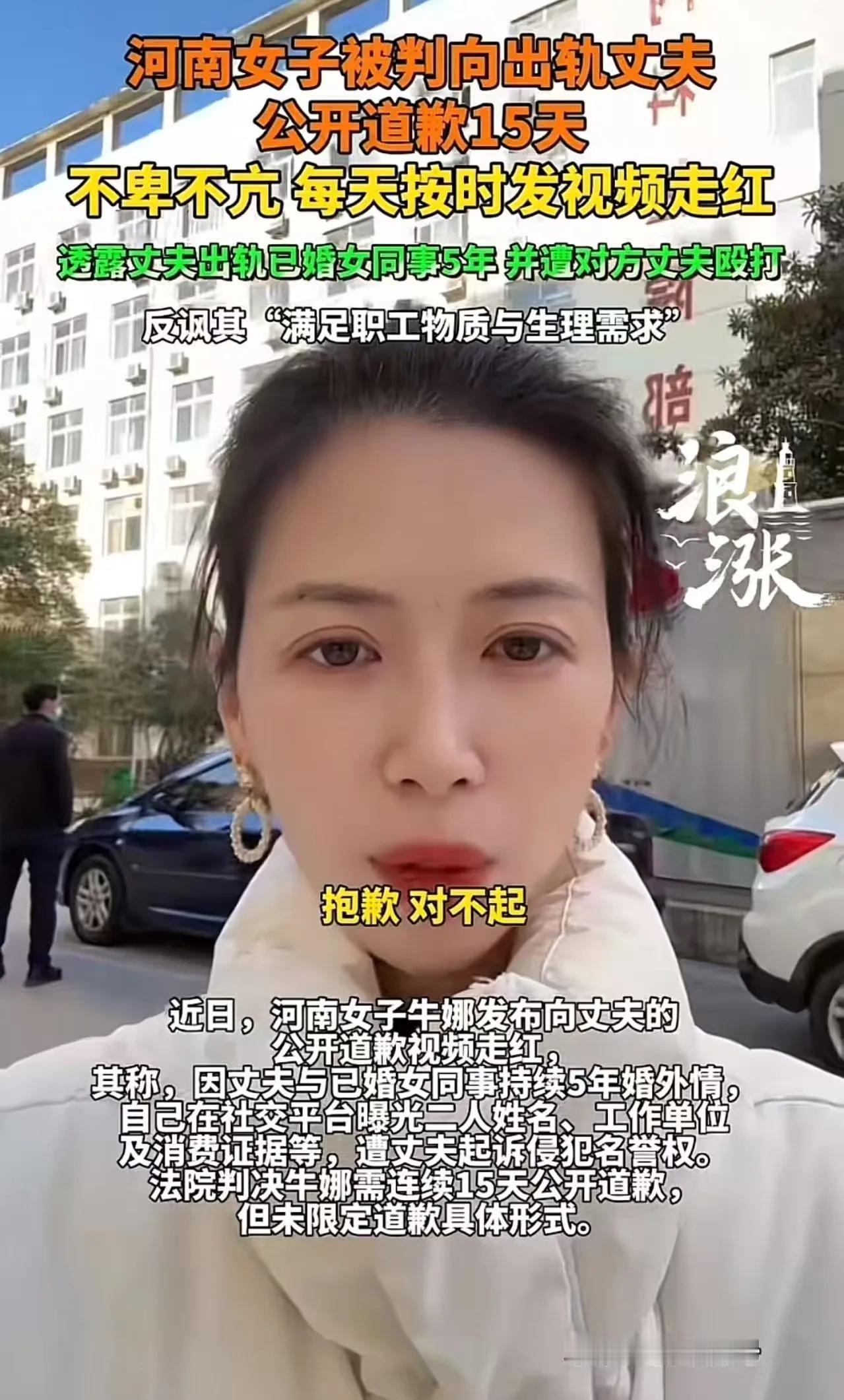 河南女子被判向出轨丈夫公开道歉15天,女子不卑不亢 每天按时发视频透露丈夫出轨已婚女同事5年,内容提及其名字及工作单位?律师:或构成侵权!网友:是法院判让女子道歉的,怎么侵权了?如果不指名道姓的,怎么证明是给本人道歉呢? 在这个信息爆炸、舆论纷纷扰扰的时代,一场看似普通的家庭纷争,却引发了社会的广泛关注和激烈讨论。河南一女子因为“出轨丈夫”事件,被法院判决在公众平台上连续15天向丈夫公开道歉。这一判决,让许多人都感到匪夷所思:难道在婚姻问题上,法律也开始干预“公开认错”了吗?更令人震惊的是,这位女子面对判决,表现得不卑不亢,每天按时发视频,坦然透露丈夫出轨已婚女同事长达五年,甚至提及了女方的名字和工作单位。 这场风波,究竟折射出什么?是个人隐私的边界被模糊,还是法律对家庭伦理的“插手”变得越发激烈?有人说,这是法院在保护受害方的权益,毕竟丈夫的出轨行为触犯了道德底线;有人则质疑:如此公开曝光,是否侵犯了他人的隐私权?特别是提到具体名字和工作单位,这样的做法是否合理?律师们纷纷发表意见,有的认为这可能构成侵权,毕竟无论如何,公开指名道姓,涉及个人隐私,难免伤害他人名誉。 然而,也有人站在不同角度:如果不指名道姓,公众又怎么知道事件的真实性?如何让公众对家庭伦理的底线有所警醒?这场“公开道歉”的判决,似乎在试图用一种极端的方式,唤醒社会对婚姻忠诚和道德底线的重视。可是,这样的“惩罚”是否走得太远?是否越过了法律与道德的界限? 更值得深思的是,网友们的反应也极具代表性。有的人支持法院的做法,认为这是对背叛家庭的惩戒;而有人则吐槽:这是“公开羞辱”,不尊重个人隐私。有人甚至调侃:如果你也被判“公开道歉”,是不是也得每天发视频,曝光“背叛”的细节? 这场风波,最终会走向何方?是引发社会对婚姻忠诚的反思,还是成为一场“舆论的秀”?它让我们不得不思考:在这个信息时代,个人隐私的界限在哪里?法律的底线又该如何界定?或许,我们都应该在这个事件中找到一点点答案——那就是:尊重、理解和守护家庭的底线,远比任何“公开曝光”更为重要。你怎么看?欢迎留言讨论,让我们一起理清这场家庭伦理与法律边界的复杂关系。婚内丈夫出轨