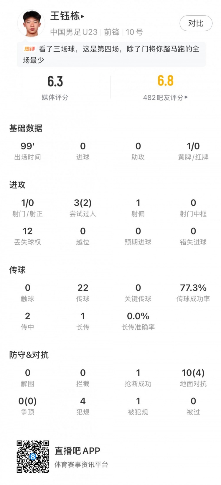 直播吧1月17日讯U23亚洲杯1/4决赛,国足vs乌兹别克斯坦,王钰栋为U23国足首发出战,加时赛第9分钟因体力耗尽被换下,最终获评6.3分。