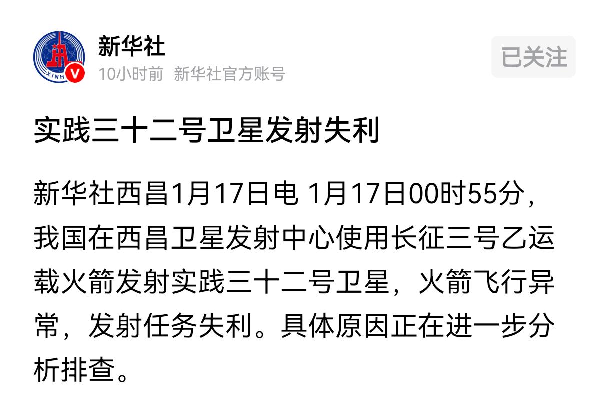 噩耗!中国神秘卫星发射失败,成熟运行30年的火箭飞行异常 17号当天中国航天发射迎来了罕见的两次失败,其中最引人注目的是在西昌卫星发射中心的长征3号乙火箭的发射失败。据了解该款火箭上携带着的是大名鼎鼎的实践32号卫星。实践系列的卫星属于我国最神秘的卫星种类之1,主要承担的是尖端科研探索这个领域。实践32号这次升空的具体任务也是高度保密的。 而这次发射的长征3号乙火箭已经是我国航天发射领域成熟运行了30年的产品,也正是由于此前的稳定发挥,所以才会被安排发射如此重要的卫星。但偏偏就是这款老将出马,在这个节骨眼上却出了问题。 据了解,火箭升空之后三级飞行出现罕见异常,最终导致火箭偏离轨道发射失败。 而随着这次失败的出现,实践系列的卫星发射也将会进行延后。这对于我们相应的先进科学探索和应用来说,必然会产生一定的迟滞作用。从这一点上来看,这次失败的损失和负面影响,不容小觑。 航天发射本身就是在走钢丝,在安全工作方面需要细致细致再细致,即便是中国航天,也不可能确保100%的成功。尤其是这种老将出马的任务,更是不能单凭的靠以前的成功经验去确保现在的安全。