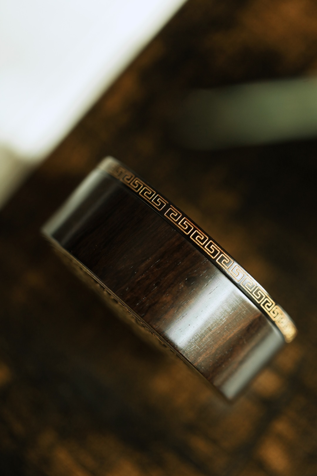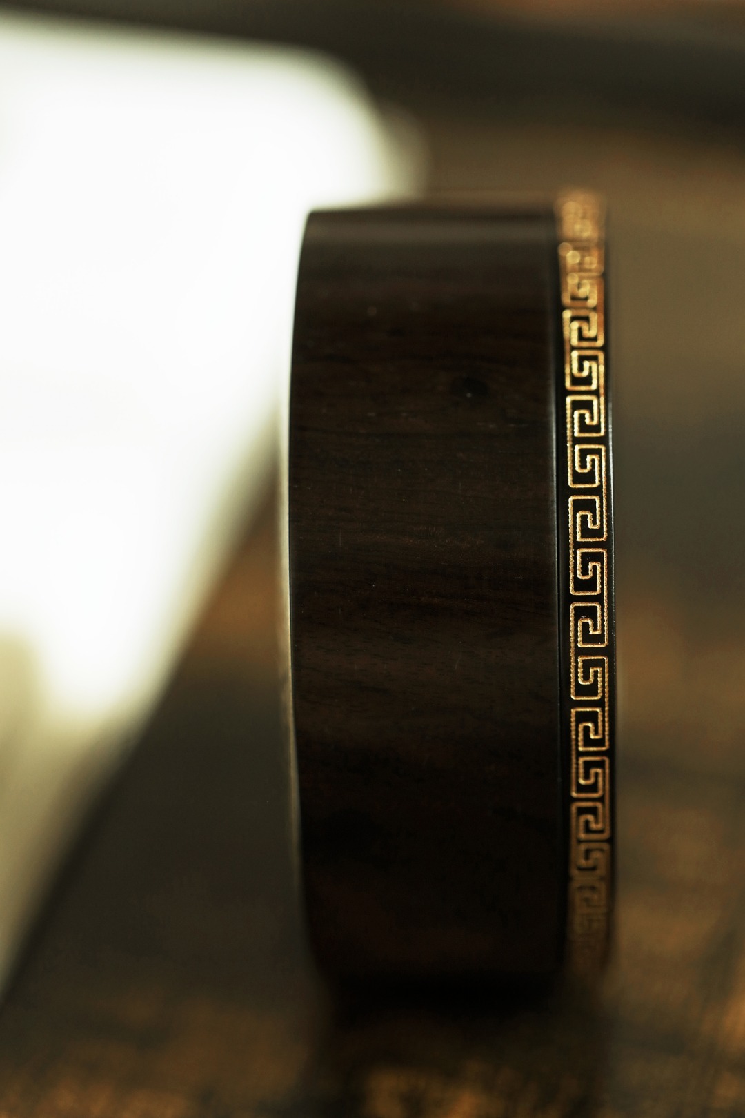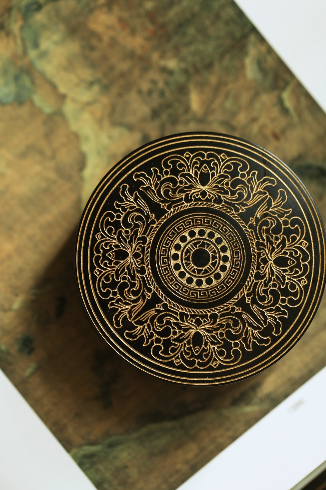 紫光檀×描金【西番莲纹】圆盒一木整挖,子母盖式,严丝合缝,盒面满雕西番莲纹,手工