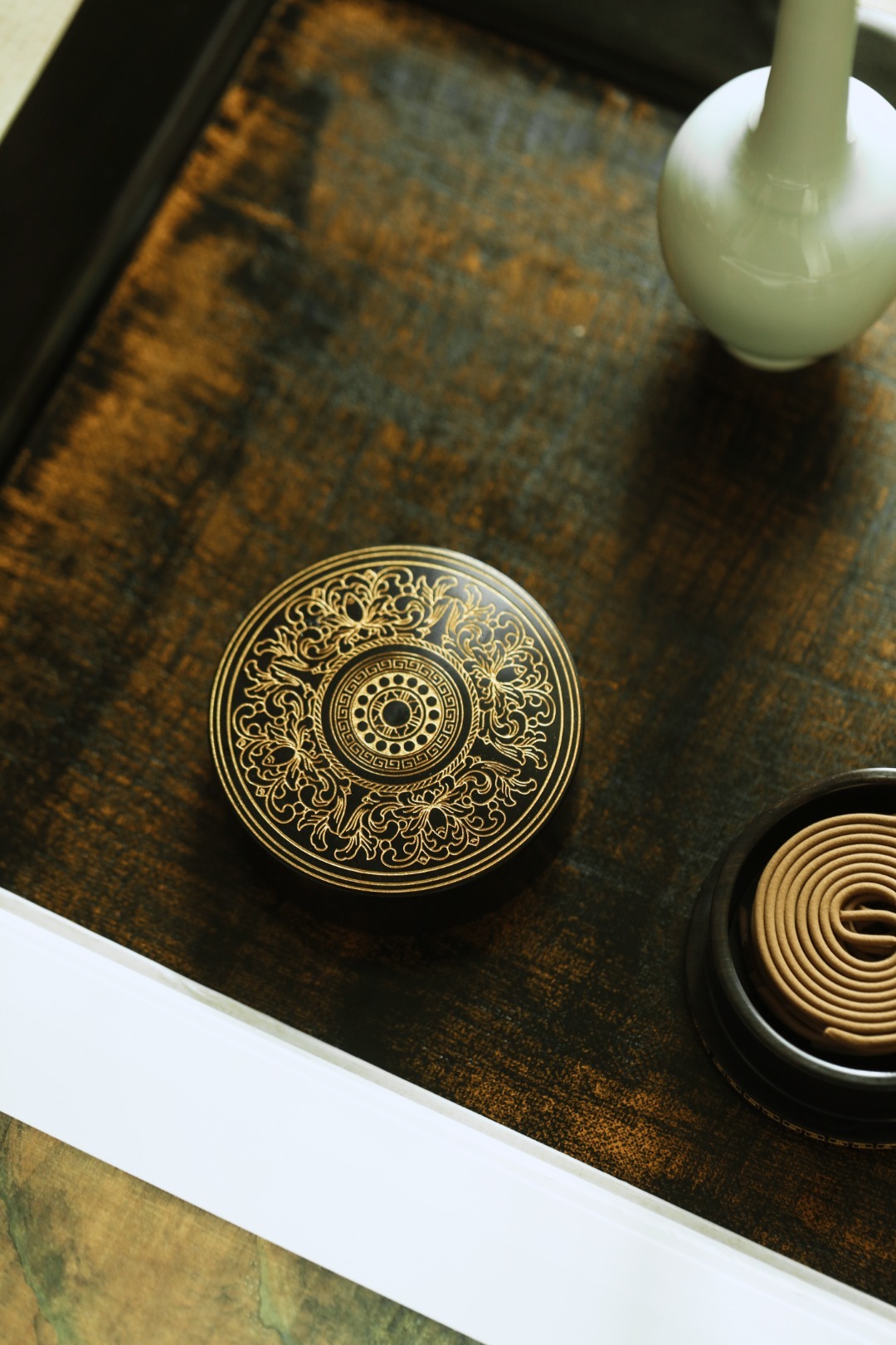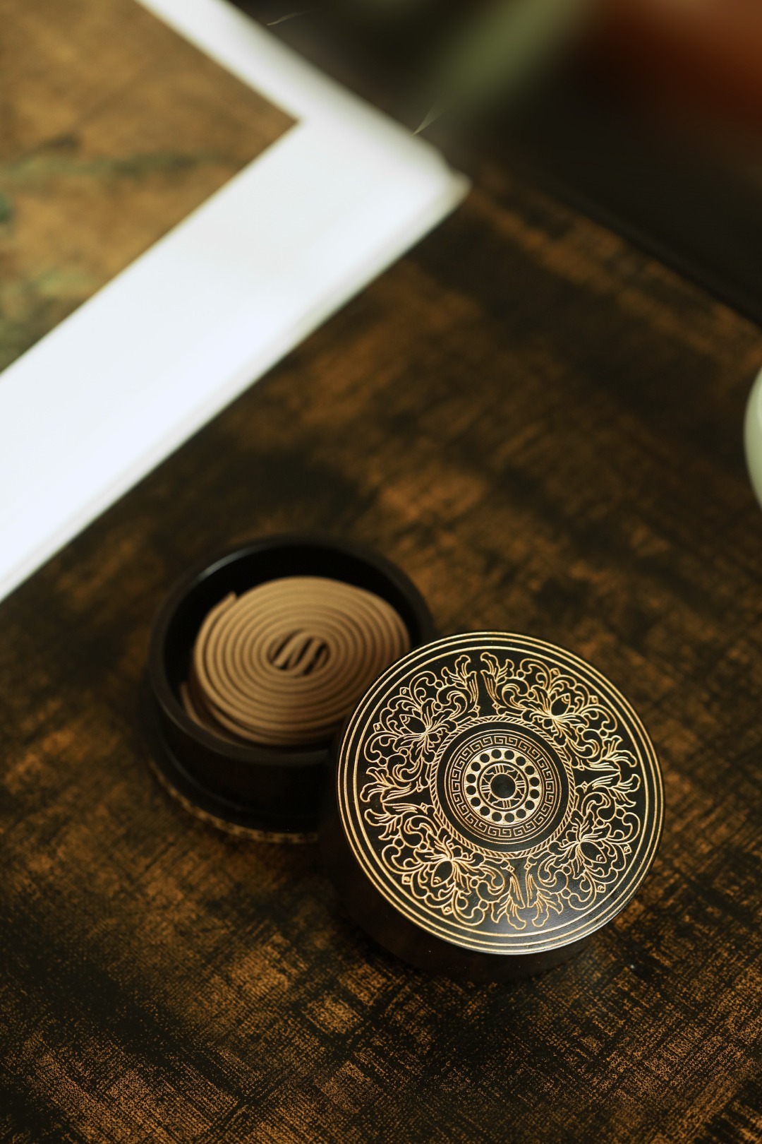 紫光檀×描金【西番莲纹】圆盒一木整挖,子母盖式,严丝合缝,盒面满雕西番莲纹,手工描金漆绘,器古韵醇浓,可藏珍玩。8.2*8.2*3.2cm 重113g 紫光檀x描金【西番莲纹】圆盒