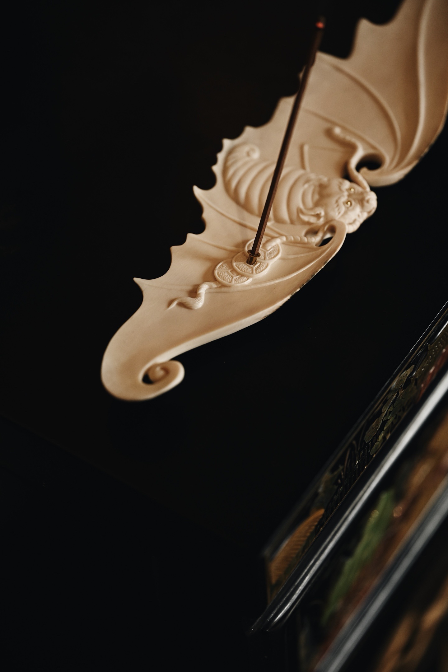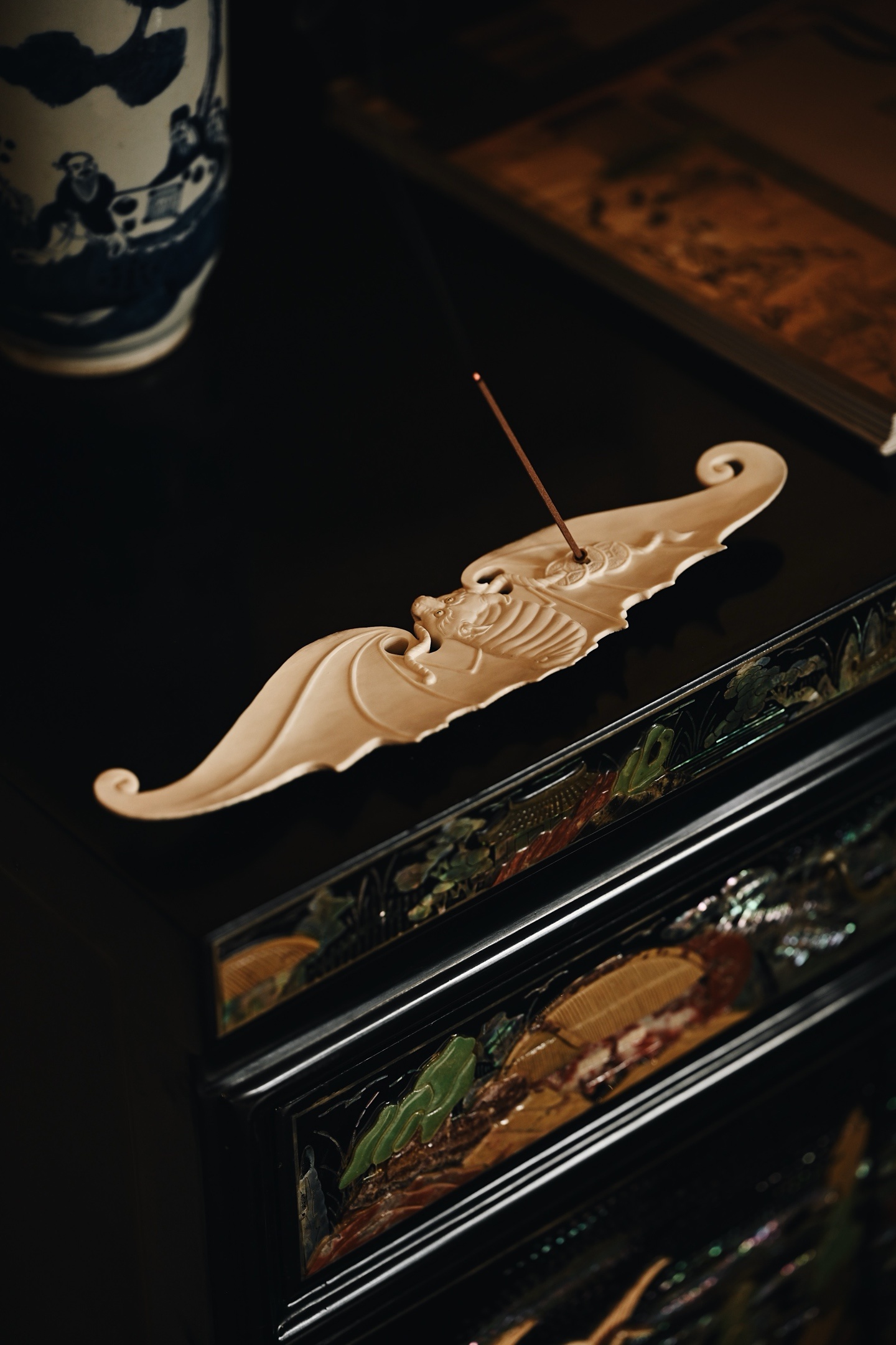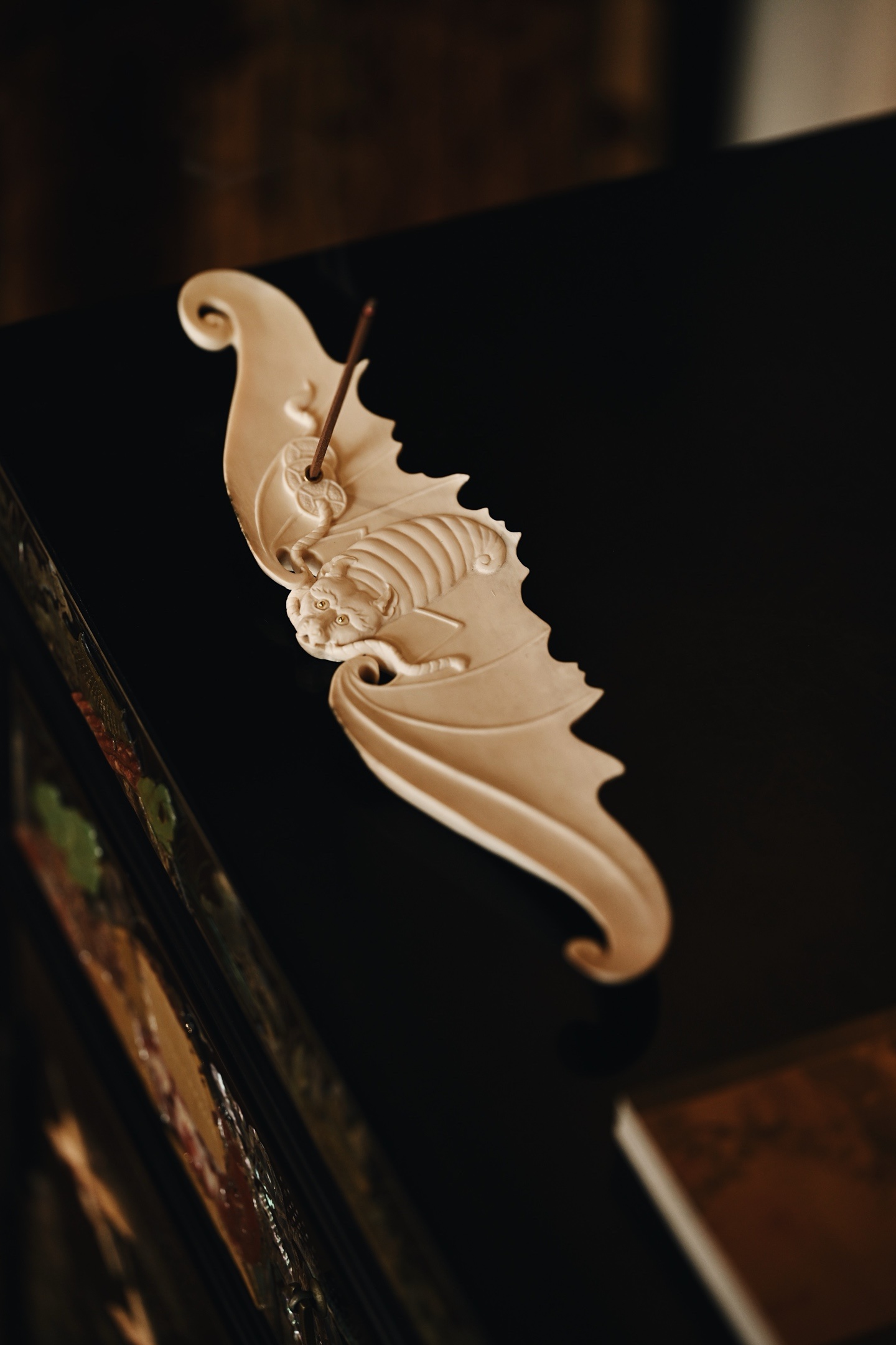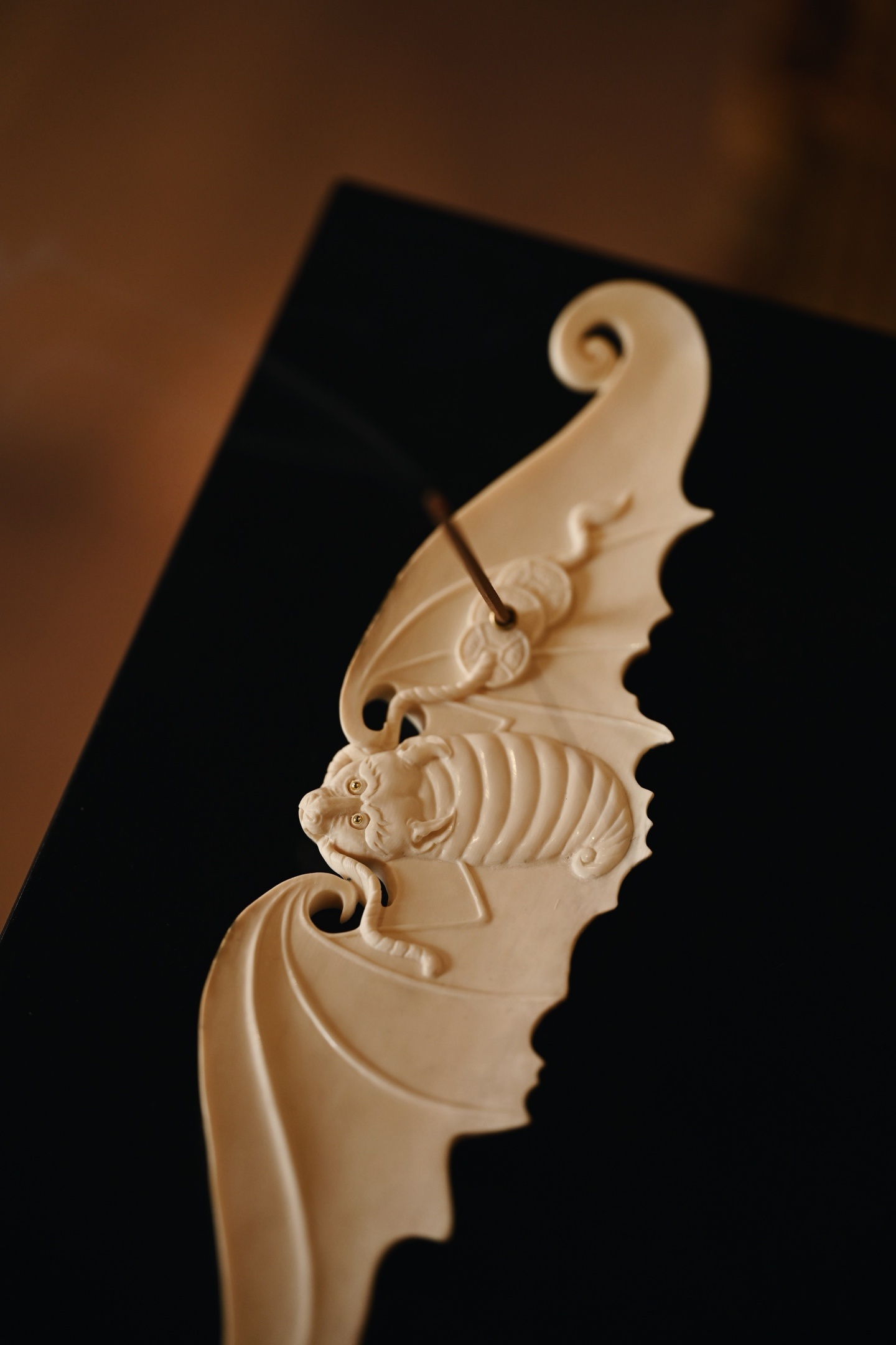 猛犸 | 蝙蝠衔财 香插此香插以温润之材雕琢而成,背面留皮巧雕,取蝙蝠衔财之吉意。蝠首双目炯炯,双翼舒展呈流云之姿,线条婉转流畅,青烟袅袅升起,似蝠穿云而来。置于案头,既是焚香之器,亦是纳福之摆件。23.7*5.7*1.5cm 78g