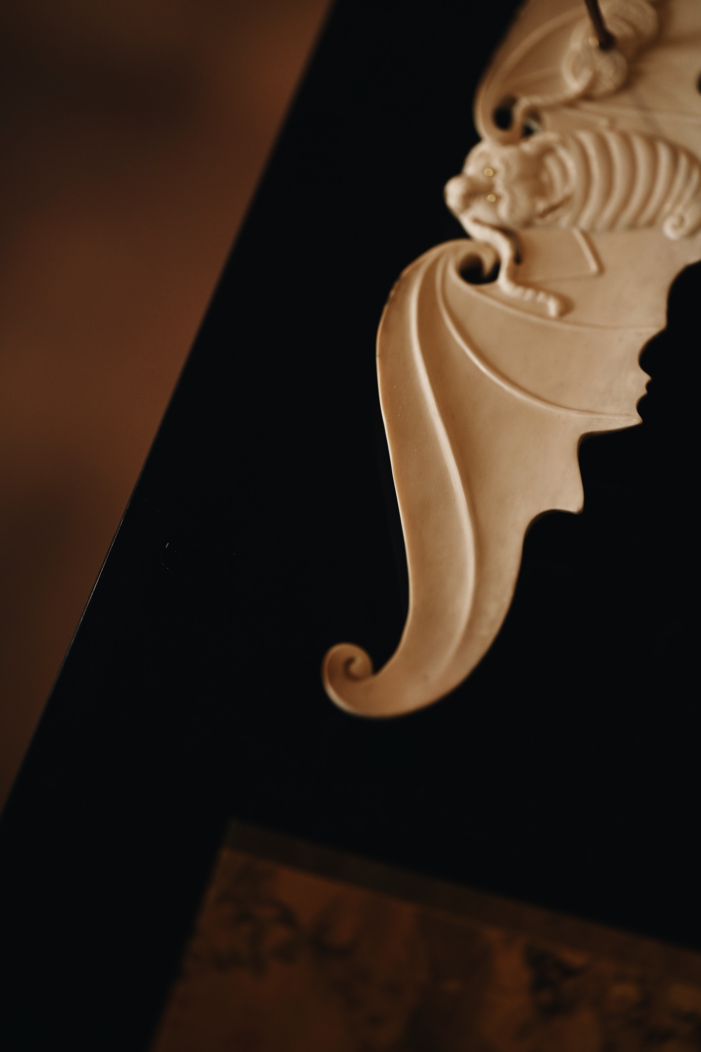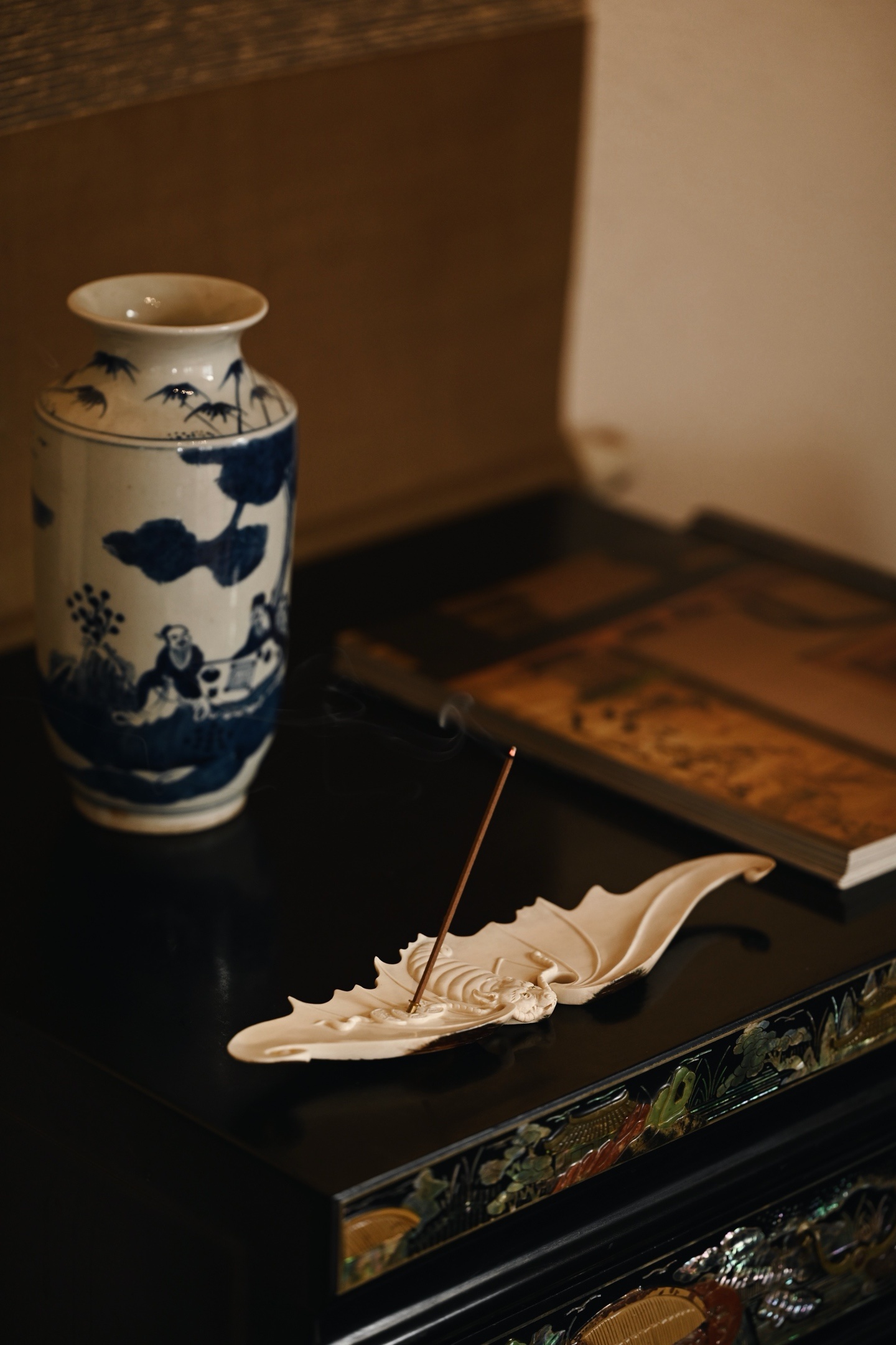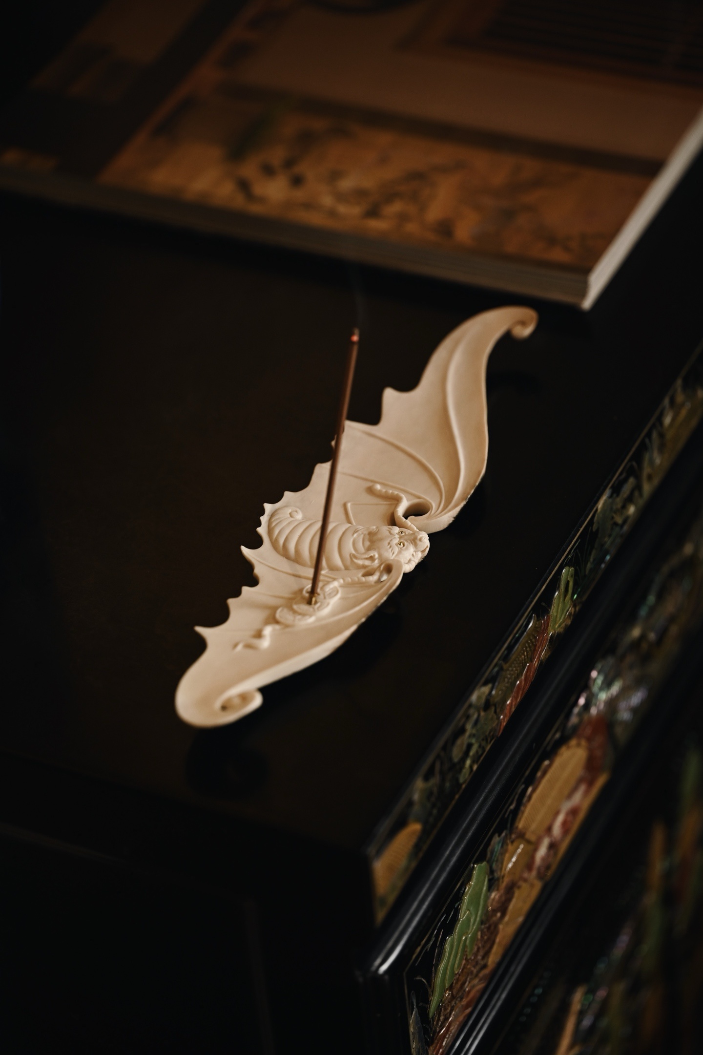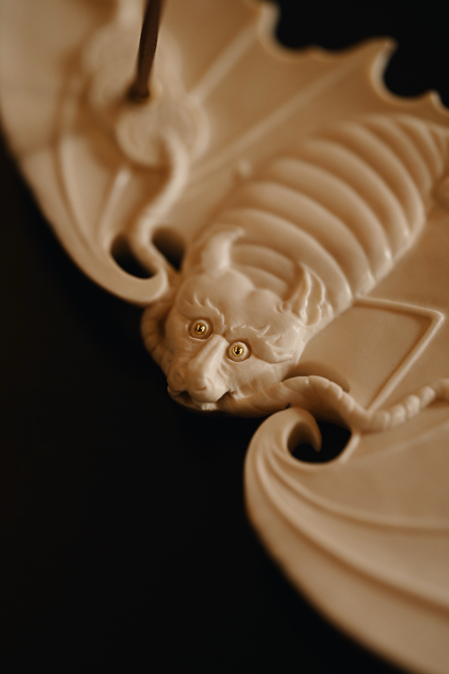 猛犸 | 蝙蝠衔财 香插此香插以温润之材雕琢而成,背面留皮巧雕,取蝙蝠衔财之吉意。蝠首双目炯炯,双翼舒展呈流云之姿,线条婉转流畅,青烟袅袅升起,似蝠穿云而来。置于案头,既是焚香之器,亦是纳福之摆件。23.7*5.7*1.5cm 78g