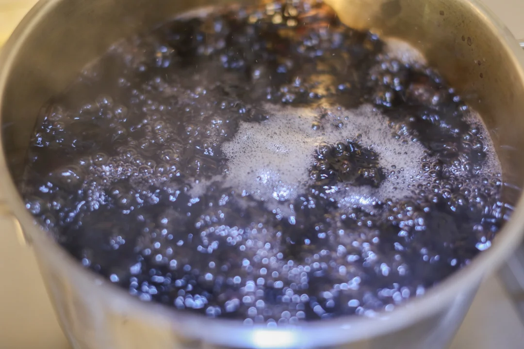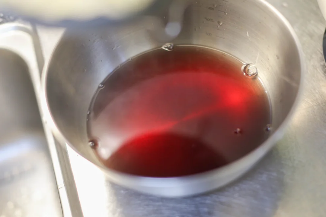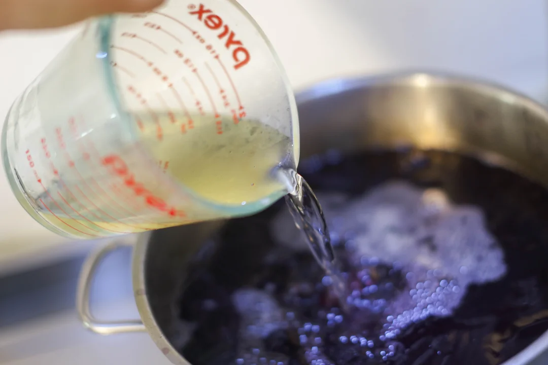 把过滤出来的紫苏汁再次放入锅中加热,放入白砂糖,捞出浮沫,用中火熬煮5分钟左右,加入白醋,慢慢混合均匀后关火。加入醋的瞬间,颜色会刹那间染成紫色,看到这样的转变都莫名感动和幸福。
