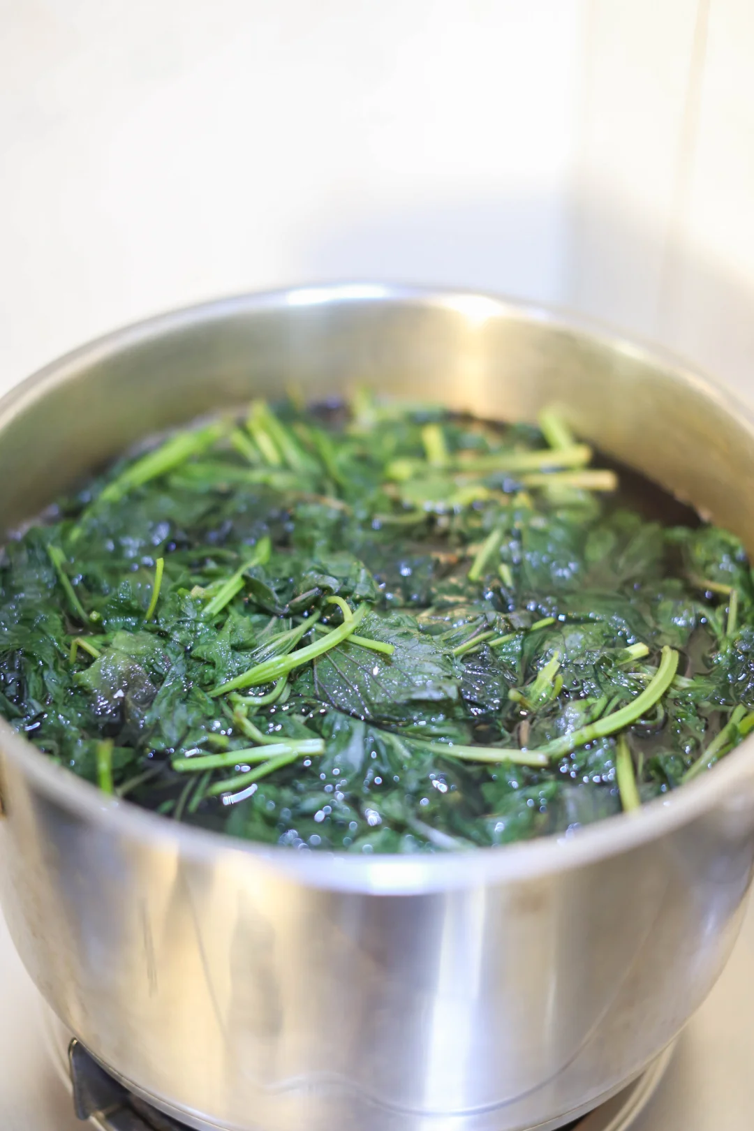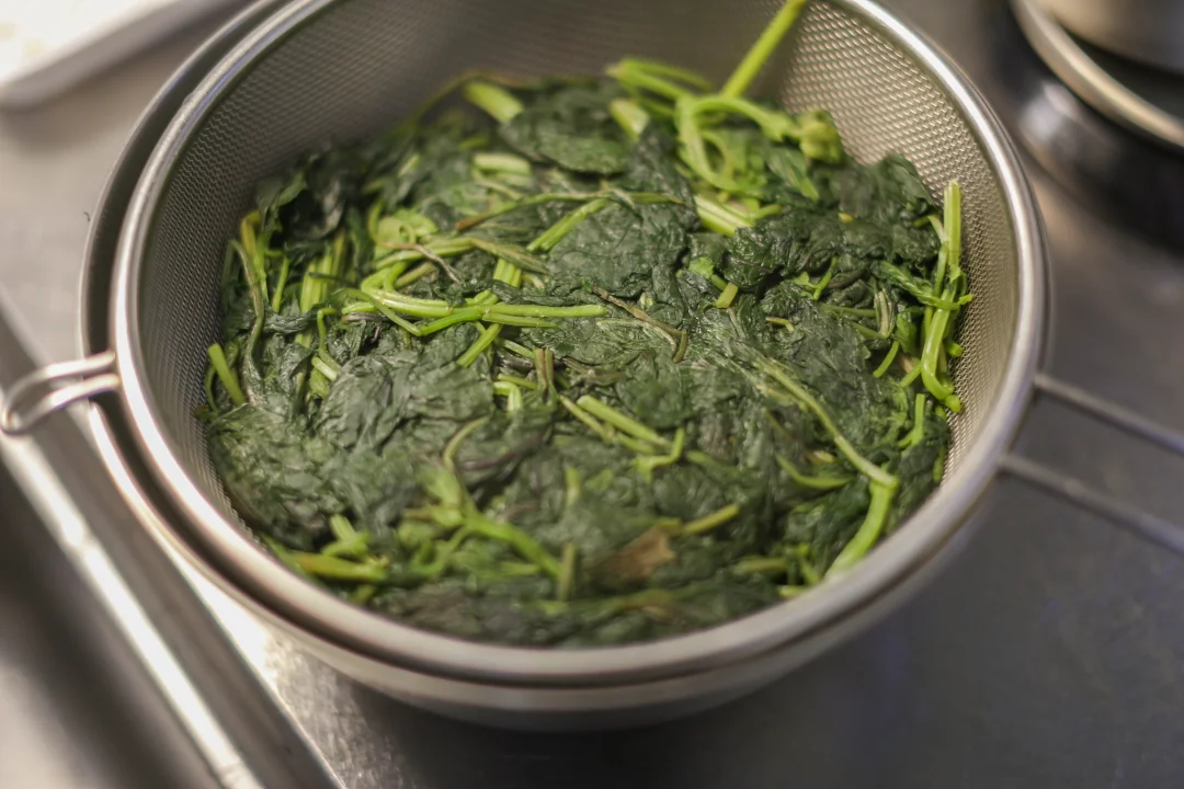用不锈钢锅将材料中的水煮沸,将紫苏叶子分3-4次放入锅中,熬煮5分钟左右将紫苏叶子倒在过滤网上,用铲子把紫苏叶里面的汁液彻底控干。