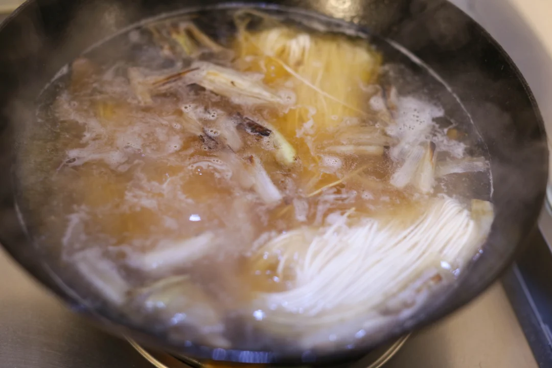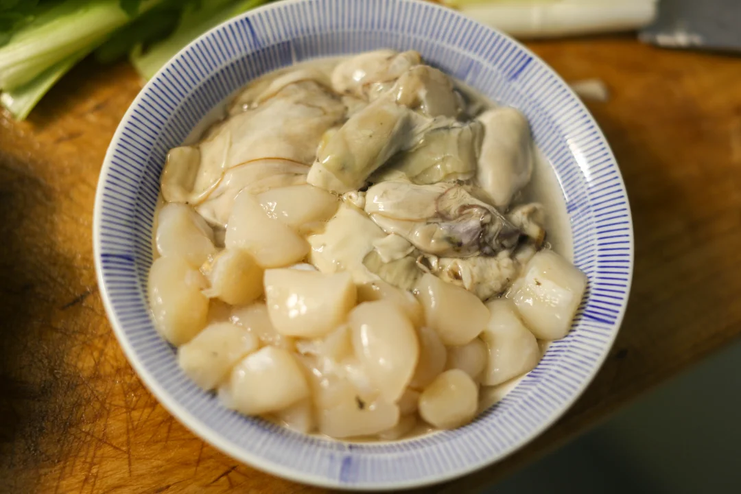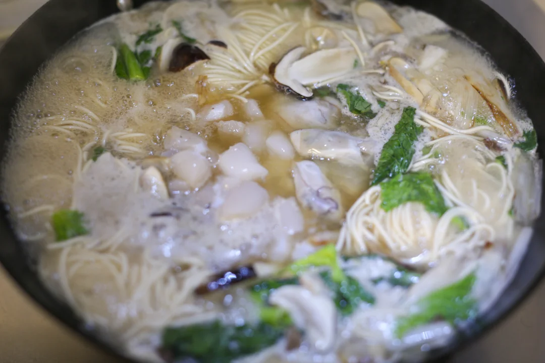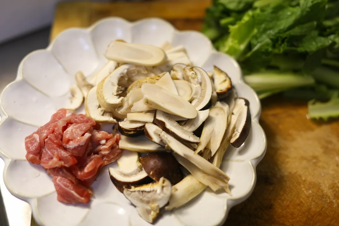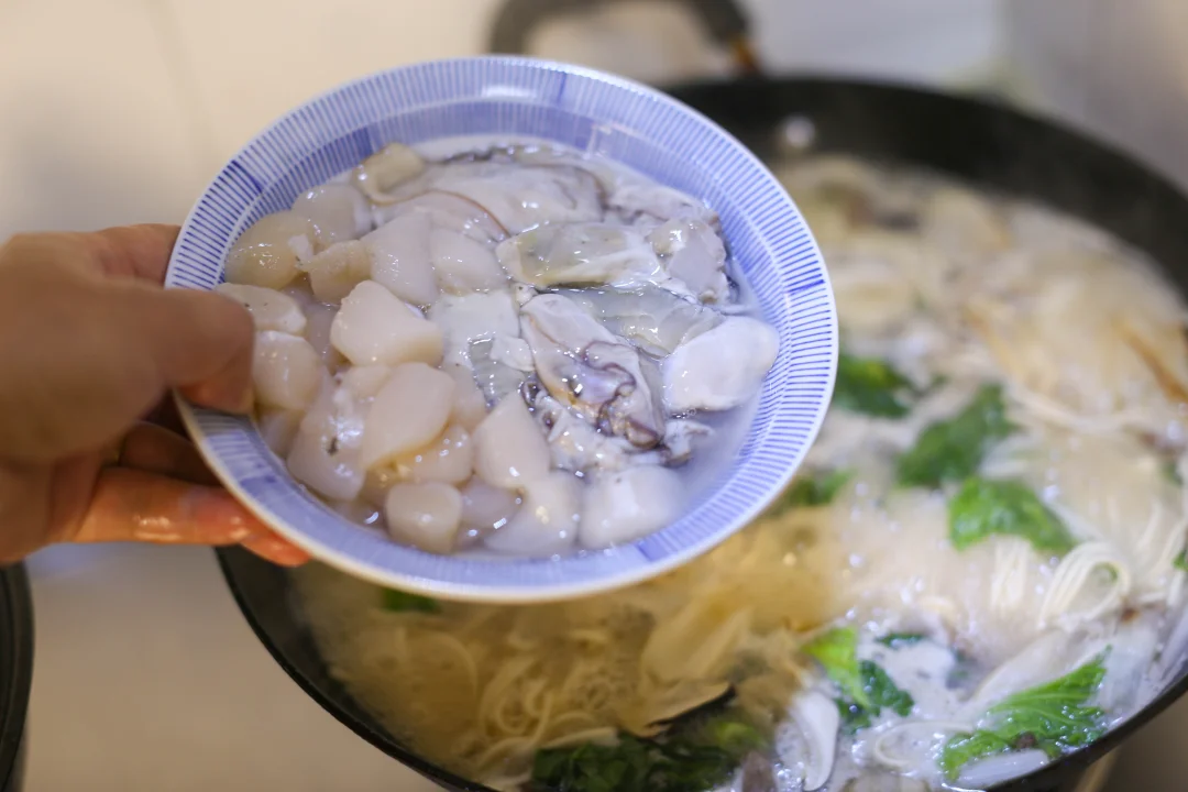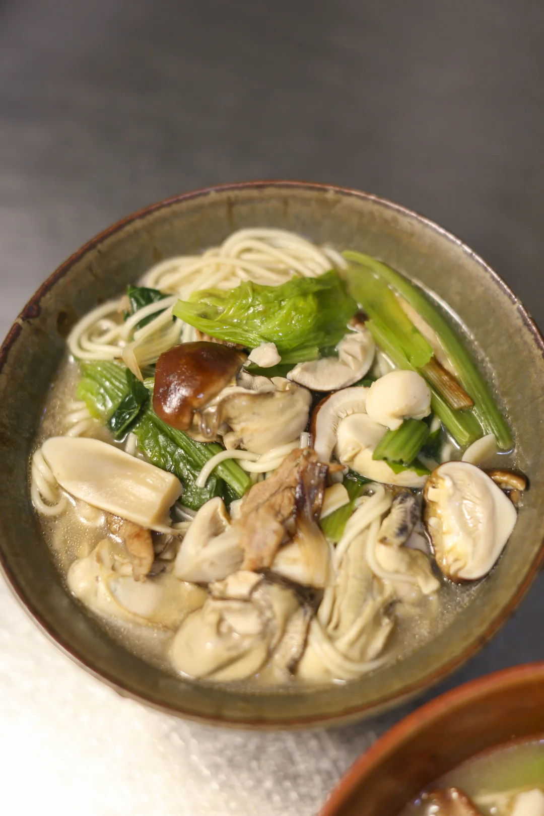 松茸清洗干净,切片装。五花肉或者前腿肉适量,切片。新鲜的扇贝柱和牡蛎肉提前准备好,自己喜欢的蔬菜,切断。 葱白去掉里面的黄心,切成长段。 锅里放适量底油,放入五花肉片炒出油脂,放入葱白段,炒到金黄色,加入热水。 放入面条,煮到七分熟的时候加入牡蛎肉和扇贝柱,放入青菜和松茸片,直至面条和小海鲜煮熟即可。 一碗松茸海鲜面,简单、朴实、鲜到眉毛!