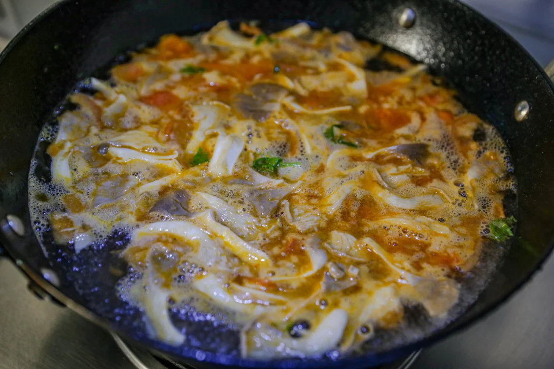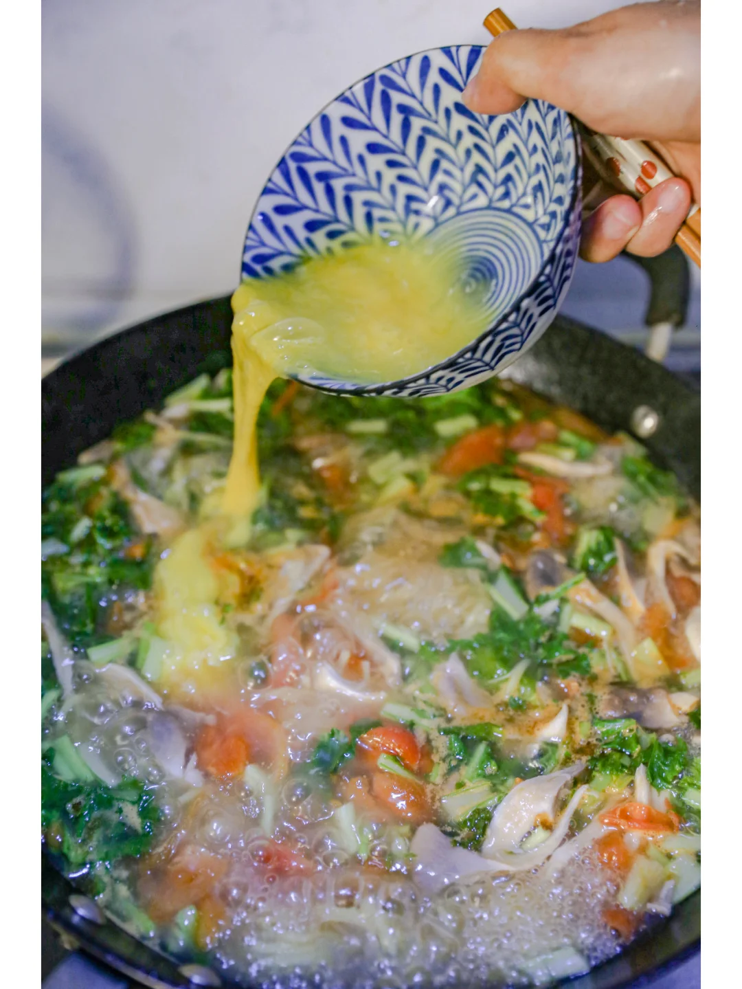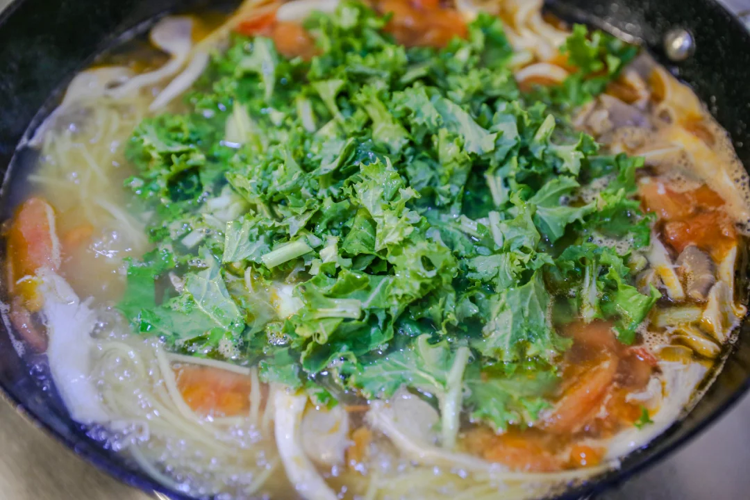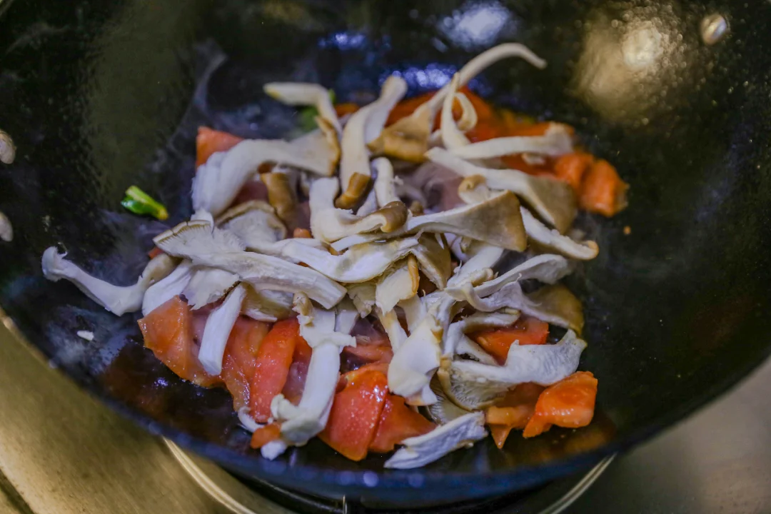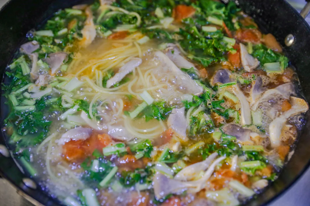 妈妈味道的玉米汤面条 朋友给邮寄了一些玉米面条,做了妈妈味道的玉米面条。 西红柿、蘑菇、春天里的苔菜切成段。 葱姜蒜爆锅之后,加入西红柿块,炒出一些浓汁之后加入蘑菇翻炒均匀,放入适量生抽酱油,加入开水。 玉米面条提前泡软,加入汤锅中,煮软即可。 出锅之前加入苔菜段和适量食盐以及芝麻油。 根据自己的喜好加入全鸡蛋或者鸡蛋液。