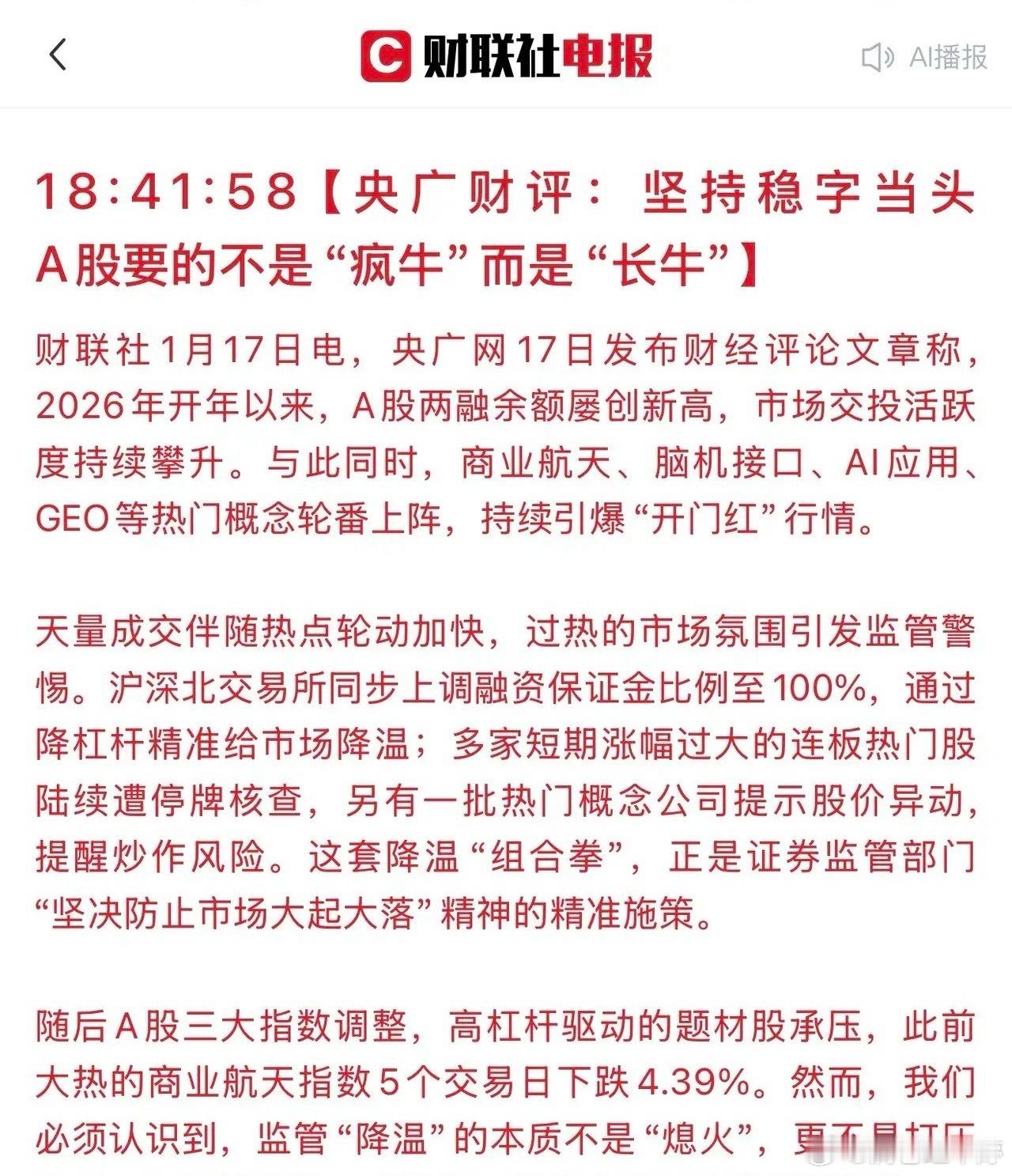 利好消息!A股经历监管精准降温后,周末传来权威安抚声音,为市场稳定预期、提振信心注入强心剂,对下周行情构成明显利好。此前,A股开年以来两融余额屡创新高,商业航天、AI应用等热门板块出现过度投机、交易拥挤现象,部分个股脱离基本面非理性炒作,甚至存在操纵股价等违法违规行为。为此,监管层果断出手:沪深北交易所同步上调融资保证金比例至100%降杠杆,热门妖股被停牌核查,多家蹭热点公司遭监管问询,一套“组合拳”精准给市场降温。但这一举措引发部分投资者误读,担忧市场被刻意打压,而此次权威解读明确打消了这一顾虑。解读核心要点清晰:其一,监管降温的本质是“优化市场生态”,而非“打压市场”,是“降温”而非“熄火”,目的是坚决防止市场大起大落,巩固稳中向好势头;其二,明确区分“真概念”与“伪龙头”——商业航天、AI应用等赛道代表未来产业方向,其热度是市场对科技发展的信心体现,监管支持的是有核心专利、研发投入与产品落地能力的“真价值”企业,打击的是仅在互动平台模糊关联、靠合作框架蹭热点却无实质支撑的“伪龙头”,同时引导上市公司聚焦主业、修炼内功;其三,最终目标是培育A股“慢牛”“长牛”,通过引导资金向价值投资聚集,推动市场长期健康发展,让投资者共享中国经济高质量发展红利,而非纵容短期投机的“疯牛”。此次周末的安抚发声,有效稳定了市场情绪,纠正了认知偏差,让投资者看清监管逻辑的核心是“去泡沫、留真金”。短期情绪波动后,市场对“慢牛”延续的预期进一步夯实,为后续行情平稳运行奠定基础。个人观点,仅供参考,不代表任何投资建议!
