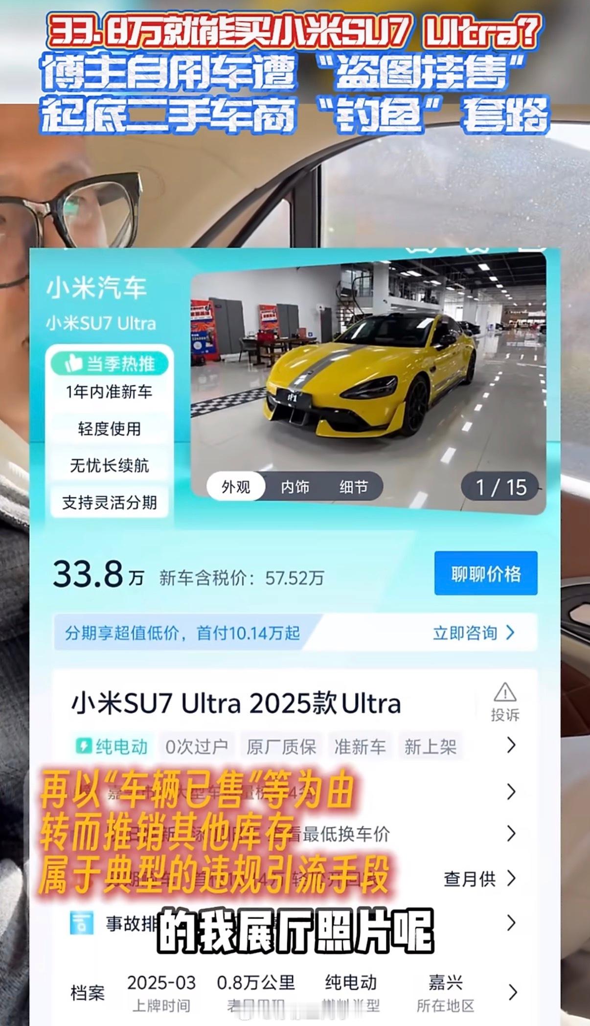 真离谱啊,车主本人在线揭秘二手车商套路,拿着别人的照片挂在平台 号称是自己的车源,靠着低价引流,结果到门店一看并没有这辆车徐洁云转发辟谣低价能买二手小米车现在小米汽车在互联网上确实很火,很多车贩子都喜欢用小米汽车“演戏”,又是赔惨了,又是卖不掉,又是其他花样的等等,目的就是为了“骗客户”我印象中好像之前有个博主的车停在路边,也被车贩子拍去说是自己的车要卖…