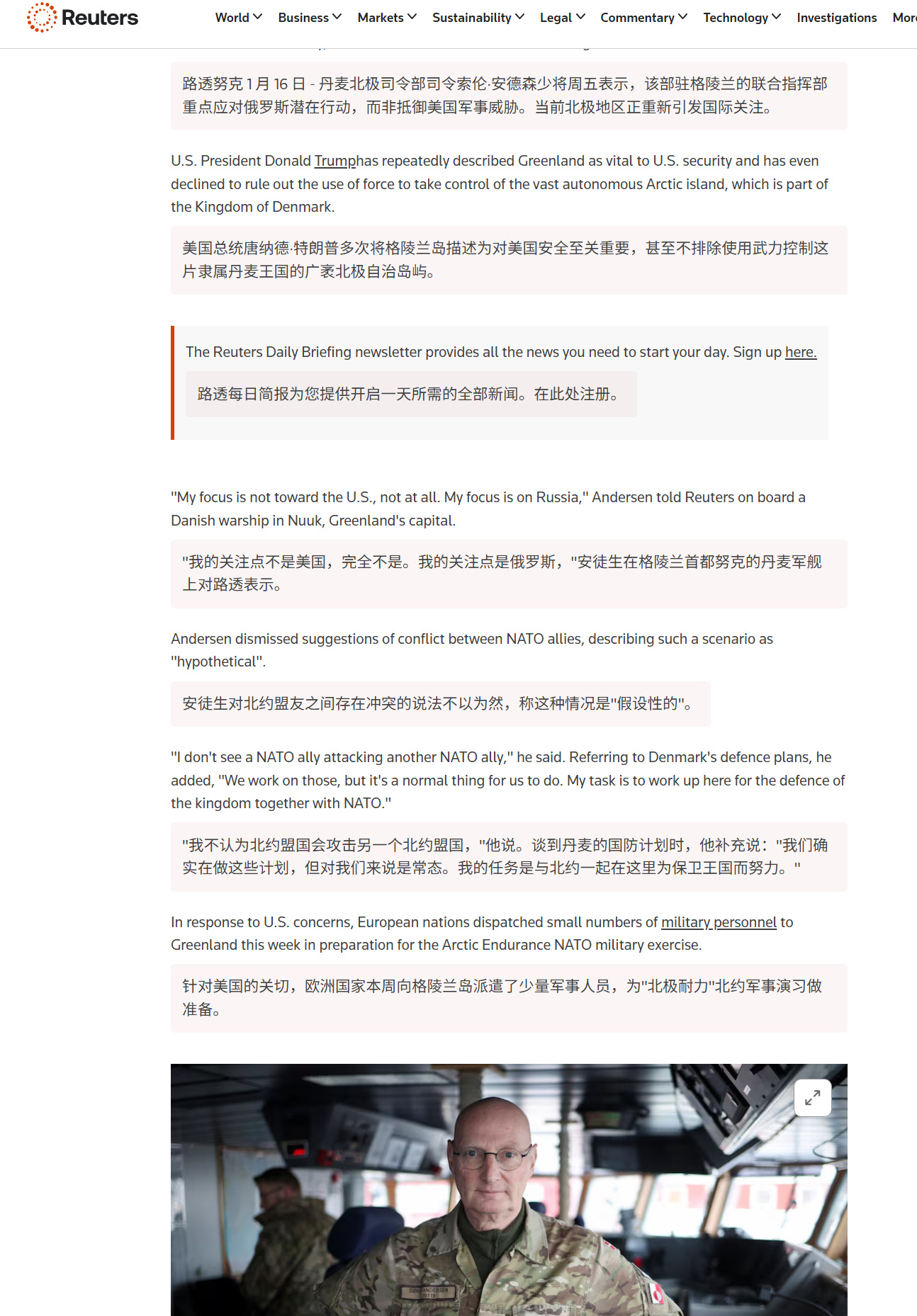 🔻丹麦北极司令部说,来自法国、挪威、英国和瑞典的士兵目前正在格陵兰岛参加军事演习。周四,他们与联合北极司令部指挥官开会,并听取了有关格陵兰和北极司令部的简报。🔻正如丹麦联合北极司令部司令官索伦·安徒生少将于 2026 年 1 月 16 日至 17 日向路透社和法新社表示,丹麦联合北极司令部邀请美国参与北约在格陵兰的军事演习。🔻如果你觉得欧洲只派了30几个人去格陵兰离谱,那么更离谱的事情可能是:欧洲人正在极力表达,这30几个人去格陵兰是为了回应美国人的“安全关切”,也就是说,它们不是去防美国人的,而是去单防俄国人的。欧洲多国派兵支援格陵兰岛热点现场海外新鲜事国际局势