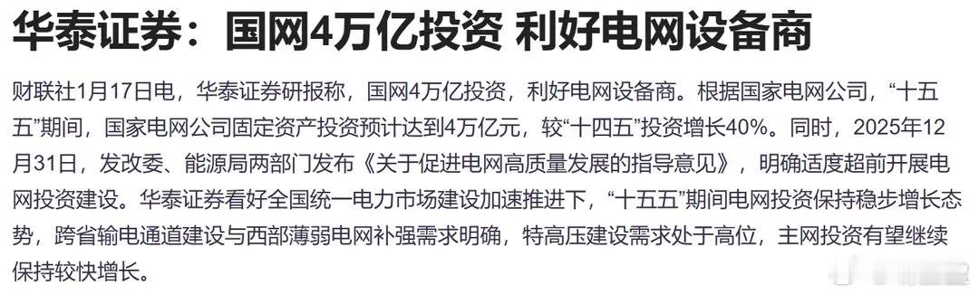 外资重仓潜伏,6只小盘电网股迎4万亿投资红利近期电网设备赛道迎来重磅政策利好,国家电网未来五年计划固定资产投资规模将达4万亿元,同比增幅高达40%,这无疑为电力及电网设备领域相关企业带来强劲的发展动能。嗅觉敏锐的外资早已提前布局,多家外资机构扎堆重仓的小盘电网标的,正成为市场关注的焦点。以下为外资重仓布局的6只电网设备小盘股盘点:1. 中电鑫龙:流通市值77亿元,当前股价11.69元。公司聚焦智能输配电设备领域,自主研发的国网标准化柜KYN28A-12(B)、磁悬浮专用变频箱式变电站等产品具备核心竞争力。其三季度前十大流通股东中云集6家外资机构,摩根斯坦利新进767万股,高盛加仓321万股,巴克莱加仓17万股,瑞银、美林、JP摩根也于同期新进前十大流通股东名单。2. 扬电科技:流通市值57亿元,当前股价29.27元。作为高效节能电气机械制造领域的专精企业,公司主营节能电力变压器、铁心、电磁线三大系列产品。三季度前十大流通股东中出现4家外资身影,瑞银新进258万股,高盛新进191万股,J.P摩根新进130万股,美林新进116万股。3. 和顺电气:流通市值45亿元,当前股价17.82元。公司自成立以来专注于电力成套设备的研发、制造与销售,核心产品覆盖高低压电器及成套设备、电工器材等品类。其三季度前十大流通股东包含4家外资机构,瑞银、摩根斯坦利、高盛均为新进,巴克莱则进行了小幅减仓操作。4. *ST惠程:流通市值31亿元,当前股价4.02元。公司主营输配电设备、新能源汽车充电桩及光伏风电EPC业务,前十大流通股东中有2家外资机构。摩根斯坦利在三季度小幅减仓84万股后,仍持有575万股;高盛则于同期新进563万股。5. 昊创瑞通:流通市值12亿元,当前股价55.2元。作为2025年9月上市的新股,公司是专业的智能配电设备生产商,主营智能环网柜、智能柱上开关、箱式变电站等产品。其三季度前十大流通股东中出现4家外资机构的身影,高盛新进23万股,美林新进15万股,摩根斯坦利新进14万股,巴克莱新进12万股。6. 众智科技:流通市值11.3亿元,当前股价37.11元。公司是国内较早投身内燃发电机组自动控制系统、低压配电自动控制系统研发制造的企业。前十大流通股东中共有3家外资机构,高盛新进79万股,J.P摩根新进28万股,巴克莱小幅减仓2.27万股后仍持有19万股,此外中信香港也重仓跻身前十大流通股东行列。