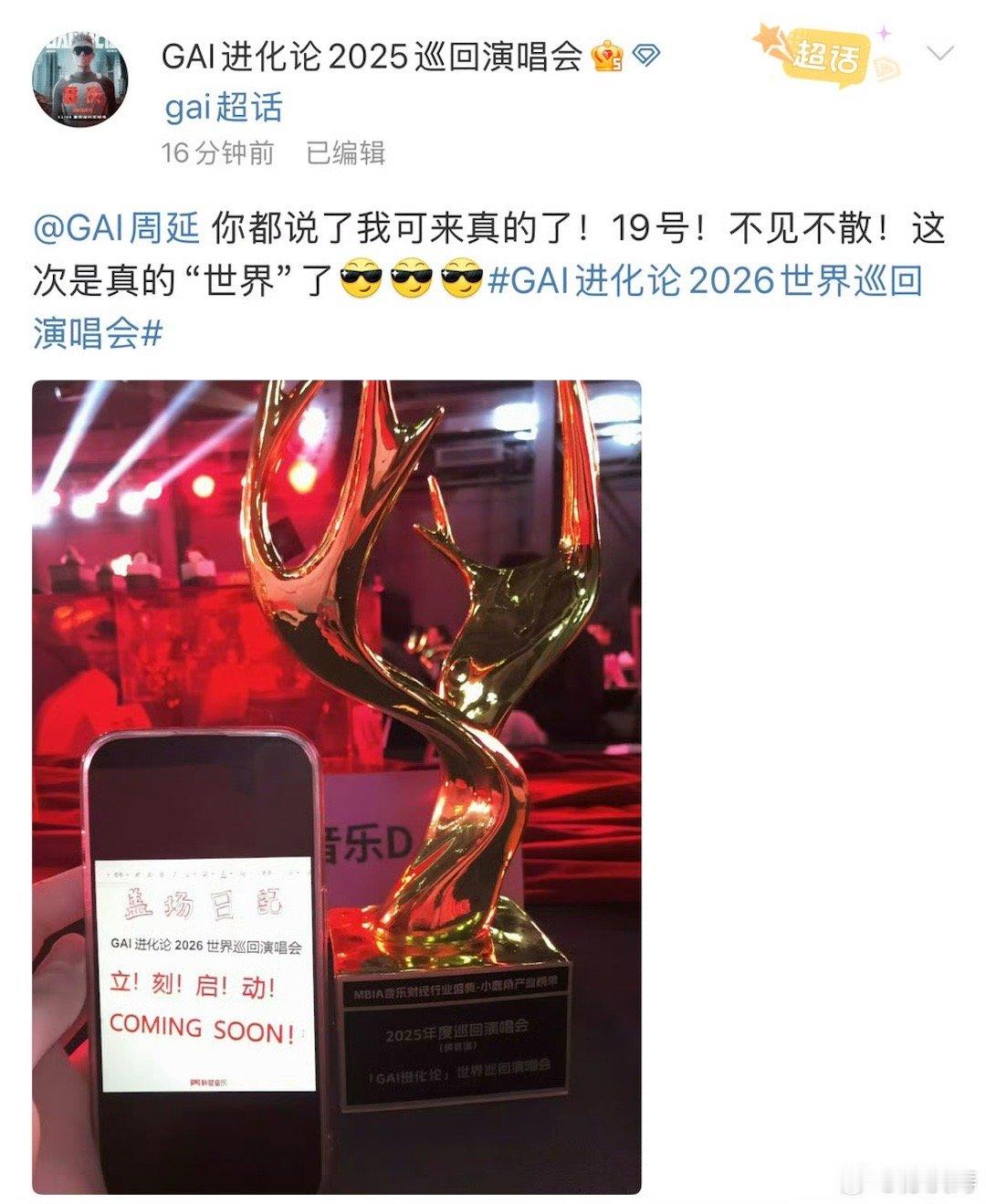 王鹤棣演唱会现场宣了GAI巡演 这是什么神仙联动!王鹤棣的舞台瞬间变成GAI巡演的起点,两位的“漏勺式”官宣又真挚又好玩。海外场速速安排,全球歌迷已就位!