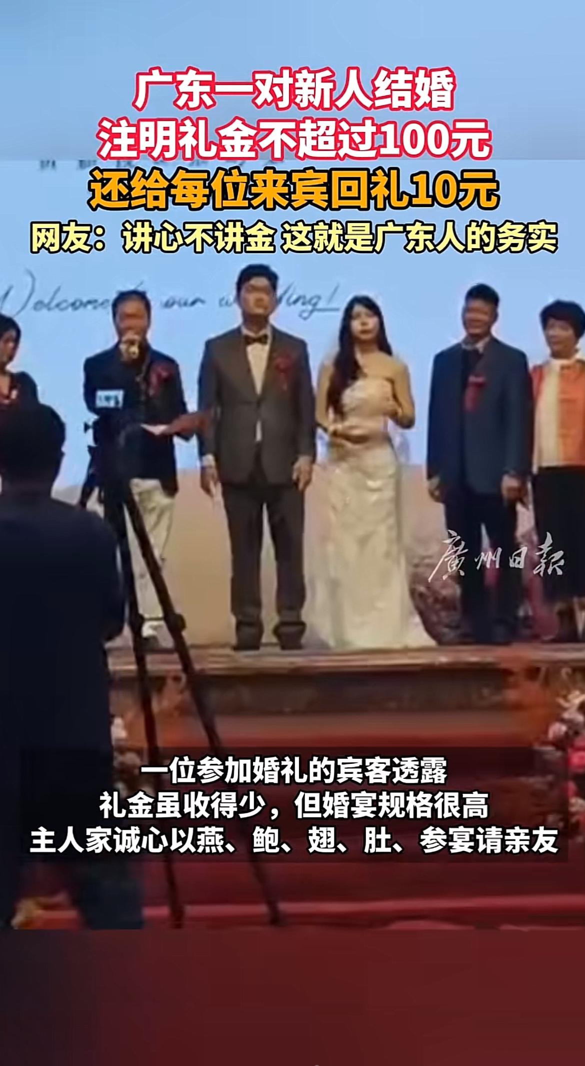 论婚礼份子钱,还得是广东人务实! 近日,广东中山一对新人结婚,邀请宾客时说明礼金不超过100元,不是靠份子钱赚回本,而是你来了就是给面子。 这对新人从校园到婚纱,双方父母都是中山本地人,白手起家,家境优渥,所以儿女结婚宴请宾客时,主动说明了礼金不超过100元,随便意思意思,给点心意就行,按照习俗,主家还会回礼10元,图的就是有来有往。 让宾客惊喜的是,婚宴规格很高,主家用的都是鲍参翅肚宴请亲朋好友。有些宾客还不好意思,想要多给礼金,但都被新郎妈妈婉拒,讲的是讲心不讲金,心意到了就代表祝福到了。 有很多外省朋友说,羡慕广东这么少的礼金,参加婚宴都没有压力,宴请就是图个热闹的,有时搞那么多礼金,都变味了,没钱都不好意思去。 其实在我们广东,不管是结婚份子钱,还是过年红包,都是讲究一个心意,5块、10块都是心意。随礼普通就是30、50,关系好一点就是100,200元,很亲很亲的亲人也就500-1000。 小时候过年收红包能收到两三百已经很开心,读大学的时候才知道外省同学一年的压岁钱能有4、5万,我震惊之余,不敢露怯。 长大后我才明白,广东的红包意思意思一下真的很有人情味,婚礼份子钱讲究的是人来就是给面子,人到就是礼到,心意到。过年红包给到福气财气喜气,5块、10块给得没压力,给得一团喜气,家长不用担心红包负担大,而不敢拜年来往,多多走动反而亲戚关系更加紧密。