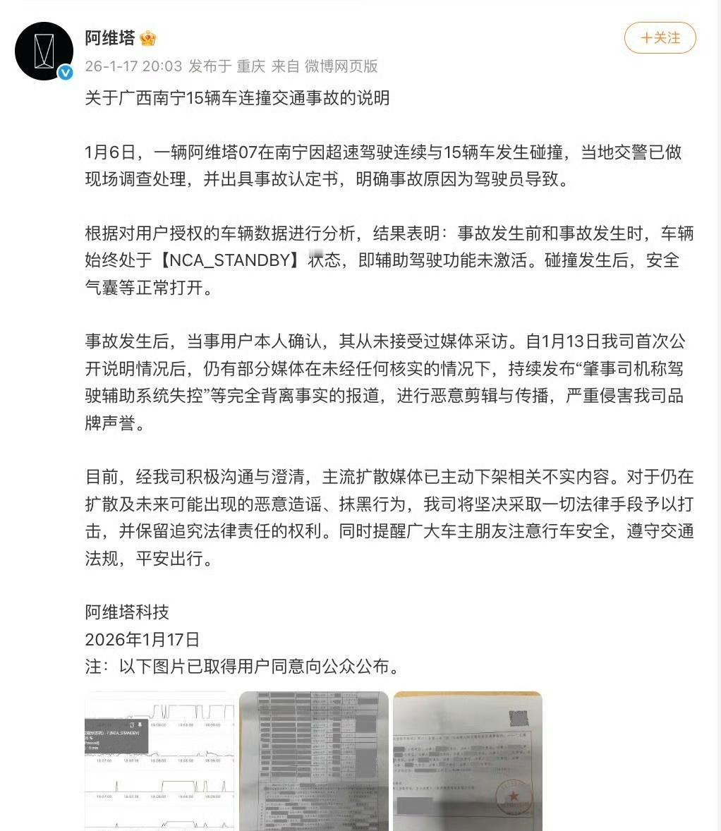 1月6日,一辆阿维塔07在南宁因超速驾驶连续碰撞15辆车。从交警出具的事故认定书来看,明确责任在驾驶员;另据后台数据显示,辅助驾驶功能全程未激活,安全气囊正常弹出,车辆系统无异常。回应称,部分媒体关于“辅助驾驶系统失控”的说法属恶意剪辑与造谣,公司保留法律追责权利。阿维塔回应南宁15车连撞事故满谈汽车 如果换是另外一家车企,类似的交通事故,估计还要被追问AEB为什么不生效。当前的新能源汽车的辅助驾驶技术,还在持续迭代升级中,在实际交通参与场景中的作用,降低了交通事故发生率,而辅助驾驶导致的交通事故中,多数还是持续脱手、持续脱眼等人为因素,在具体的新能源事故责任判定,相关责任划分应该明确,不能一味让车企背锅。阿维塔回应南宁15车连撞事故