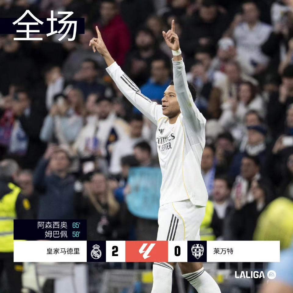 全场|皇家马德里 2-0 莱万特 18' 贝林厄姆禁区外打门被封。 33' 姆巴佩远射偏出。 37' 贡萨洛头球被扑。 ⚽️56' 姆巴佩造点并亲自主罚命中,1-0。 ⚽️65' 居莱尔助攻阿森西奥头球破门,2-0。 阿韦洛亚西甲首秀收获3分。