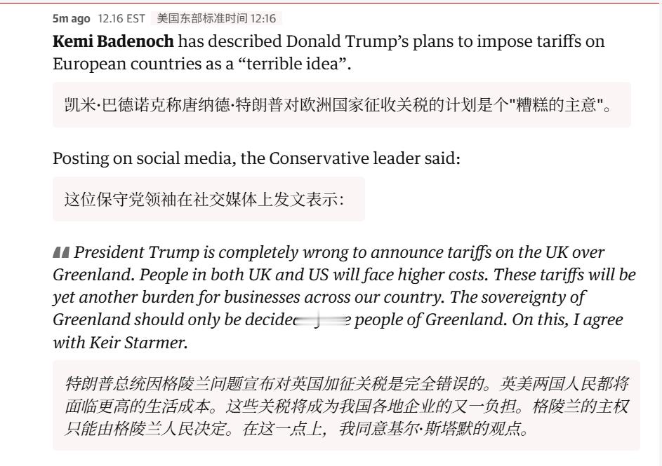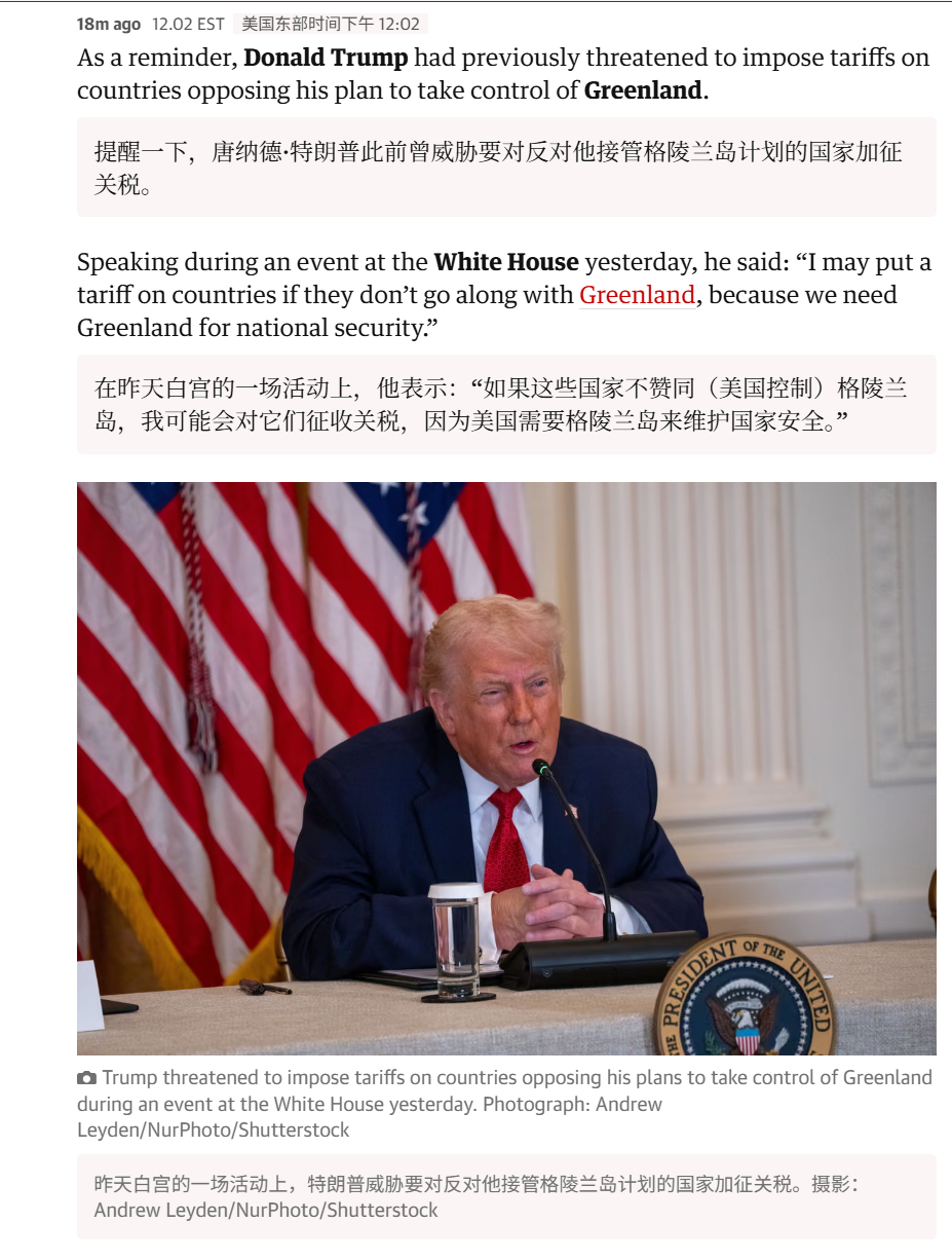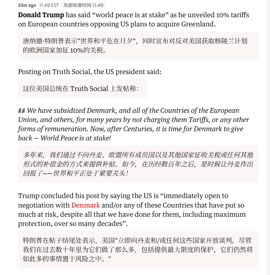 🔻特朗普表示“世界和平危在旦夕”,同时宣布对反对美国获取格陵兰计划的八个欧洲国家加征 10%的关税。🔻特朗普说:“多年来,我们通过不向丹麦、欧盟所有成员国以及其他国家征收关税或任何其他形式的补偿金的方式来提供补贴。如今,在历经数百年之后,是时候让丹麦作出回报了——世界和平正处于紧要关头!”🔻英国保守党领袖凯米·巴德诺克称特朗普对欧洲国家征收关税的计划是个“糟糕的主意”:“特朗普总统因格陵兰问题宣布对英国加征关税是完全错误的。英美两国人民都将面临更高的生活成本。这些关税将成为我国各地企业的又一负担。格陵兰的主权只能由格陵兰人民决定。在这一点上,我同意基尔·斯塔默的观点。”🔻好消息啊,这波,是美国大战欧洲八国联军了。🔻via 卫报欧洲军人稀稀拉拉登上格陵兰岛热点现场海外新鲜事国际局势